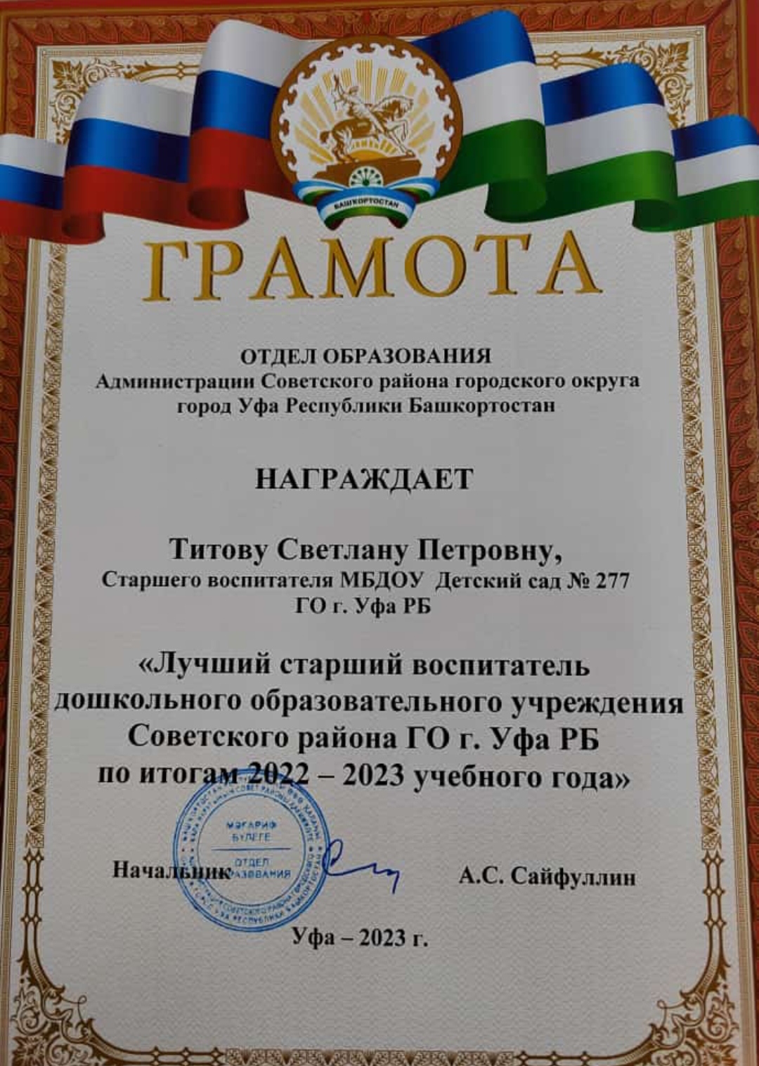 Старший воспитатель МБДОУ Детский сад N 277 г.Уфы, старший преподаватель кафедры дошкольной педагогики и психологии Института педагогики БГПУ им. М.Акмуллы, магистр образования , Титова Светлана Петровна награждена почётной грамотой отдела образования Советского района городского округа город Уфа Республики по итогам работы 2022 - 2023 учебного года.