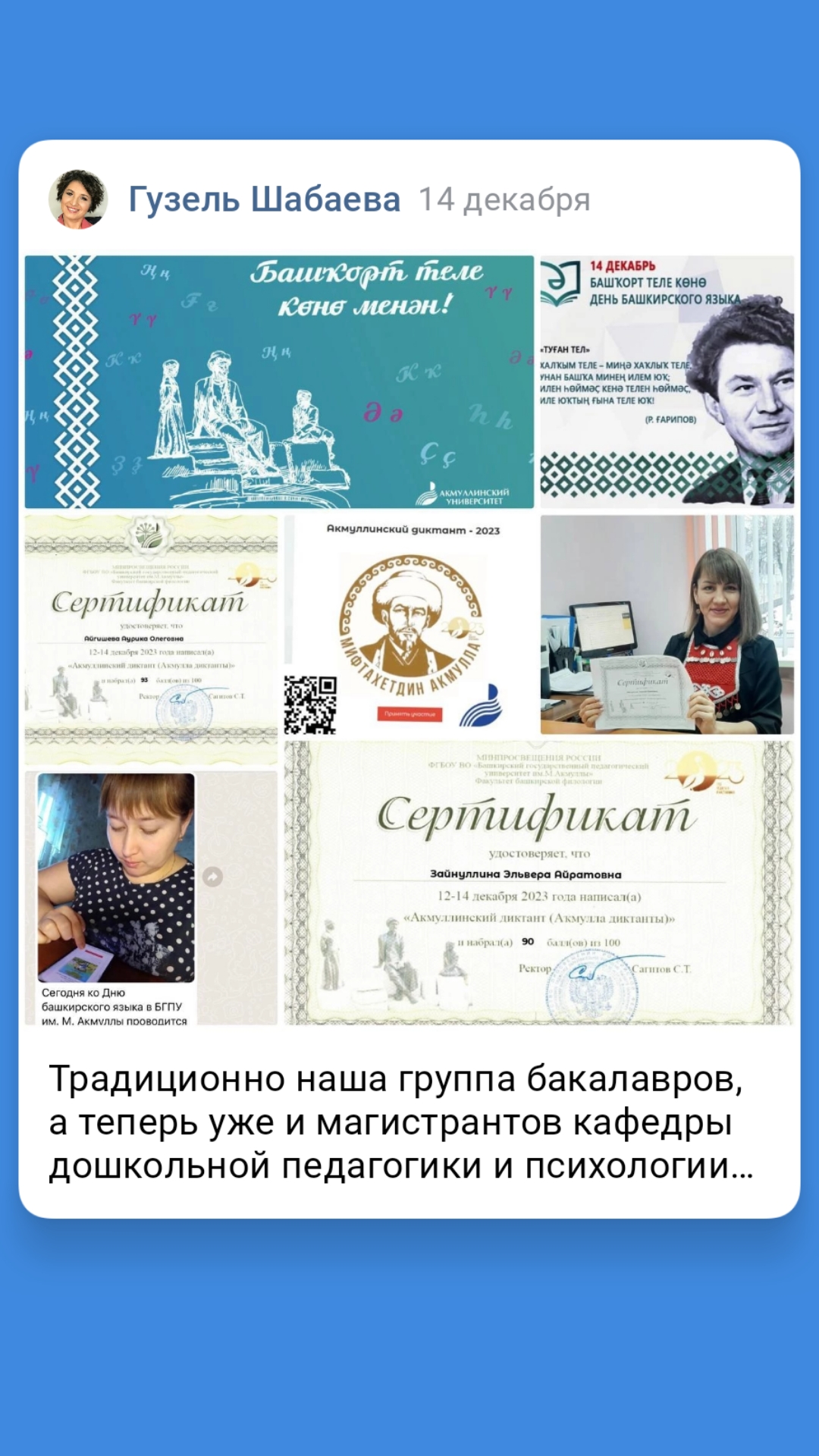 14 декабря 2023 г. Студенты, магистранты и ППС кафедры ДПиП успешно прошли Акмуллинский диктант в День Башкирского языка , День рождения М.Акмуллы . Получили сертификаты