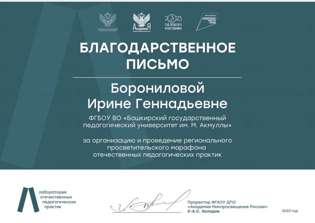 ФГАОУ ДПО "Академия Минпросвещения России" выражает Ирине Геннадьевне Борониловой, директору Института педагогики, к.п.н., доценту кафедры ДПиП Института педагогики БГПУ имени Мифтахетдина Акмуллы благодарность за организацию и проведение мероприятий регионального марафона отечественных педагогических практик в рамках реализации проекта "Лаборатория отечественных педагогических практик".