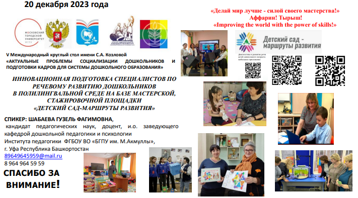 Шабаева Г.Ф. к.п.н., доц. и.о. заведующего кафедрой ДПиП ИП БГПУ им.М.Акмуллы выступила с докладом на тему: «Инновационная подготовка специалистов по речевому развитию дошкольников в полилингвальной среде на базе мастерской, стажировочной площадки «Детский сад-маршруты развития» в рамках работы V Международного круглого стола имени С.А. Козловой «Актуальные проблемы социализации дошкольников и подготовки кадров для системы дошкольного образования»: доклад в треке №3: «Научно-методические основы межкультурного взаимодействия в социальном развитии детей дошкольного возраста».
