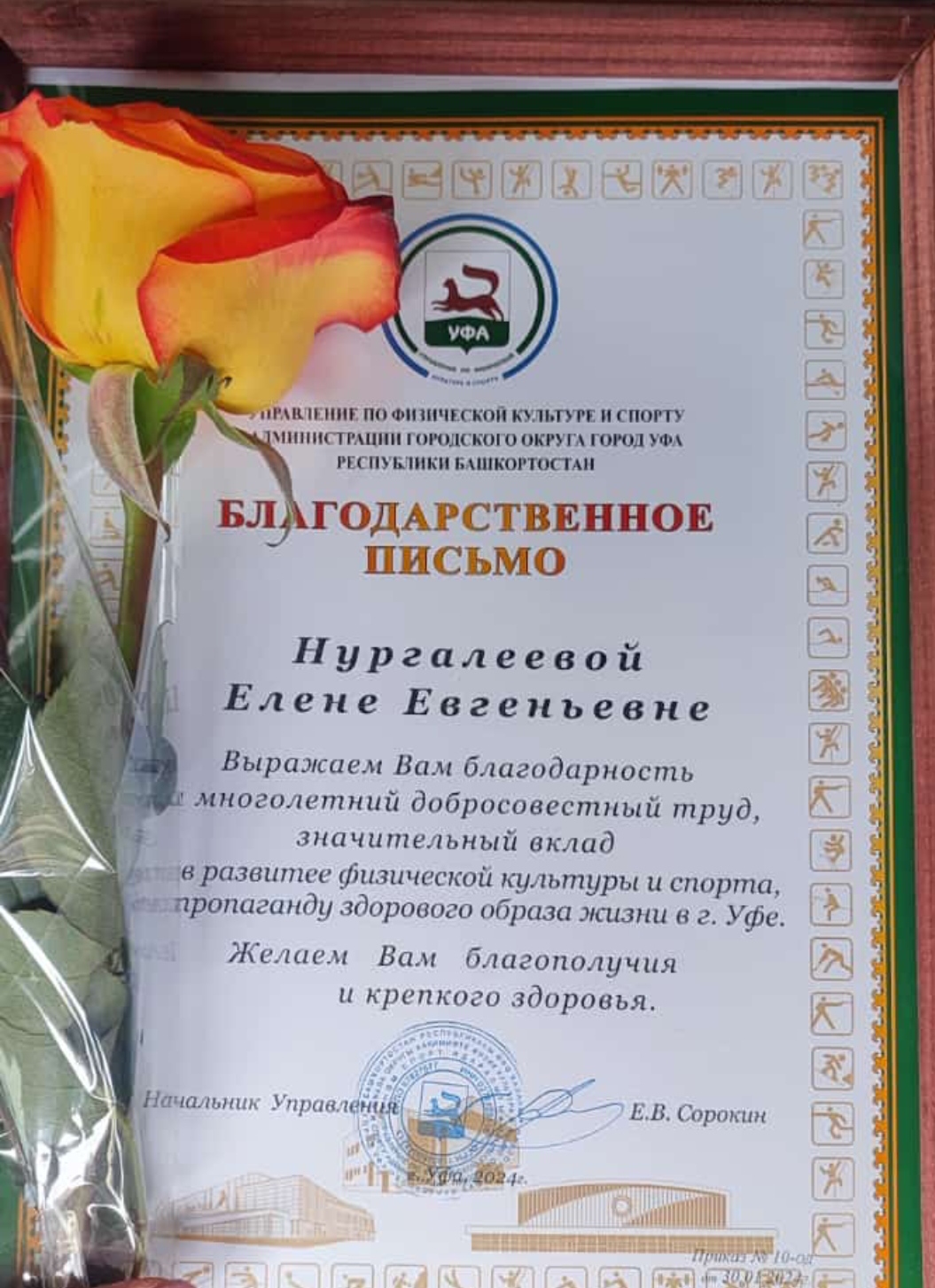 01.02.2024г. Начальник управления по физической культуре и спорту Администрации ГО г.Уфа РБ Сорокин Е. В. вручил благодарственное письмо Нургалеевой Елене Евгеньевне, студентке кафедры дошкольной педагогики и психологии Института педагогики 1 курса ЗПДОС ДО 12_23, инструктор по  физической культуре года столицы Башкортостана 2023, (победитель конкурса проф. мастерства "Педагог года ДОО"), лауреат Воспитатели России", лауреат "ГТО путь к здоровью" и др.