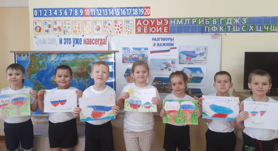 Ребята с интересом слушали рассказ об истории Крыма, о достопримечательностях и природе полуострова. Дети принимали активное участие: читали стихи о Крыме, смотрели презентацию "Крым и Россия - едины!", рисовали рисунки про воссоединение Крыма с Россией.