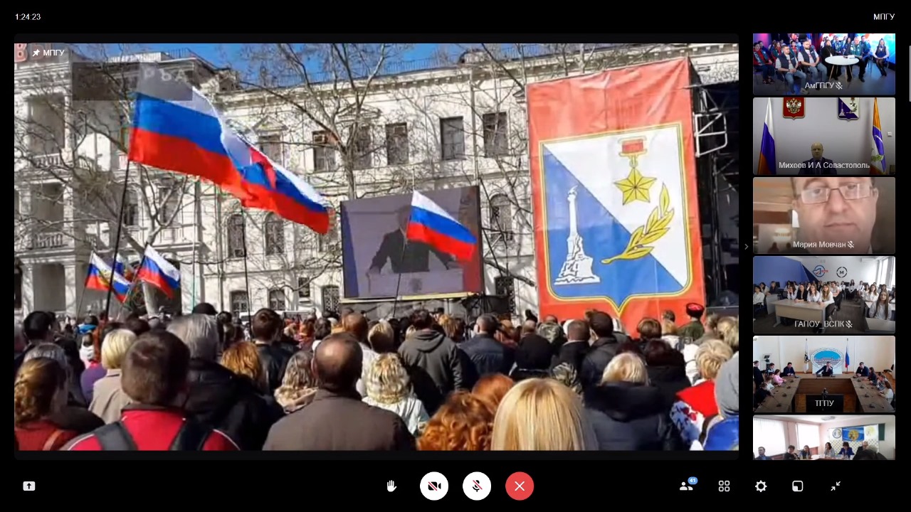 18.03.2024г. преподаватели и студенты, магистранты кафедры ДПиП Института пелагогики БГПУ имени Мифтахетдина Акмуллы приняли активное участие в работе Телемоста Ассоциации педагогического образования на базе МПГУ г.Москва "10 - летие воссоединения Крыма и Севастополя с Российской Федерацией «Крымская весна» онлайн. Присоединяемся к Всероссийскому флешмобу «Крым! Россия! Навсегда!» 10-летие воссоединения Крыма и Севастополя с Российской Федерацией отпраздновали в МПГУ в формате телемоста.