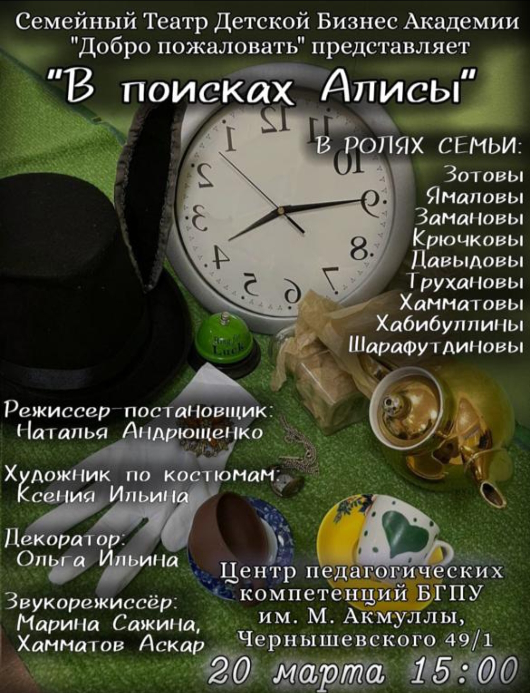 20.03.2024г. Шабаева Г.Ф., и.о. заведующего кафедрой ДПиП Института педагогики, руководитель ЦПК Профессионалитет: Педагогика БГПУ имени Мифтахетдина Акмуллы Набиулина Н.Г., Директор Детской Бизнес Академии Банникова Ирина Владимировна организовали показ спектакля для преподавателей и  студентов  БГПУ им.М.Акмуллы в условиях реализации комплекса мероприятий, посвященный Году Семьи в РФ и Году заботы о людях ОВЗ в РБ. Народный Семейный театр Детской Бизнес Академии "Добро пожаловать". Спектакль "В поисках Алисы" сегодня прошел  на базе центра педагогических компетенций Профессионалитет:  Педагогика Башкирский государственный педагогический университет имени Мифтахетдина Акмуллы