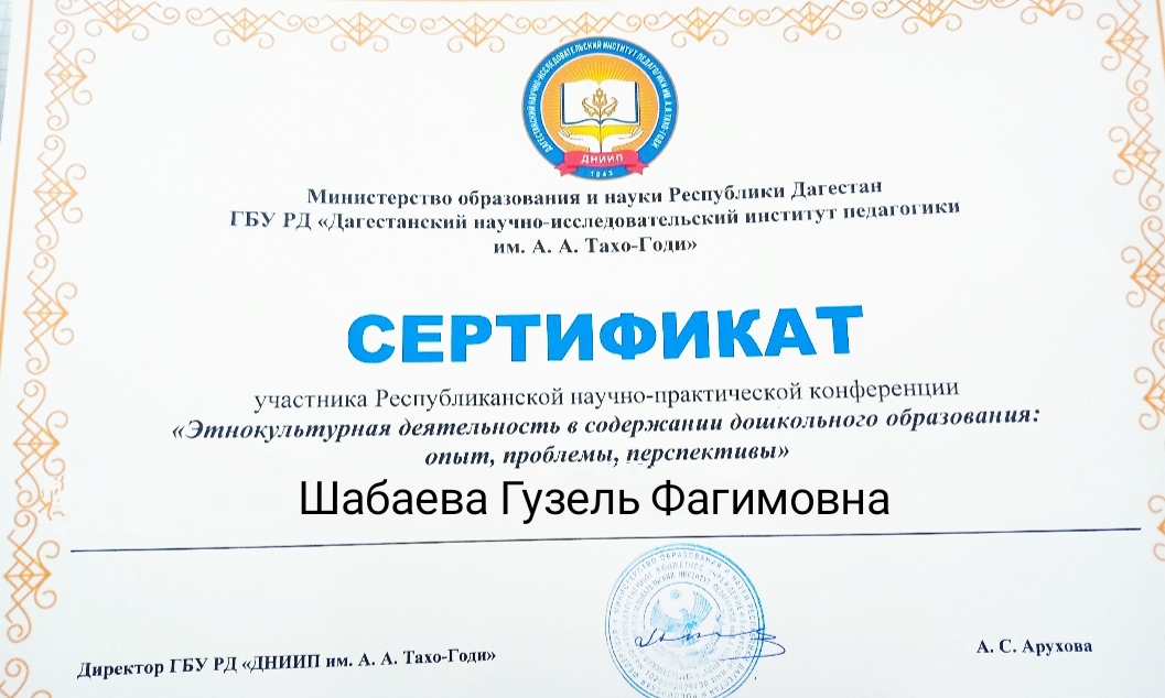 Гадельшина Лилия Габдулхаевна студентка кафедры ДПиП Института педагогики Акмуллинского университета, заведующая ДОО Гасанова Л.Н., научный руководитель, к.пбн., доц. Шабаева Г.Ф. приняли участие в Республиканской научно- практической конференции "Этнокультурная деятельность в содержании дошкольного образования: опыт, проблемы, перспективы", Дагестанский научно-исследовательский институт педагогики имени А.А. Тахо-Годи г. Махачкала.