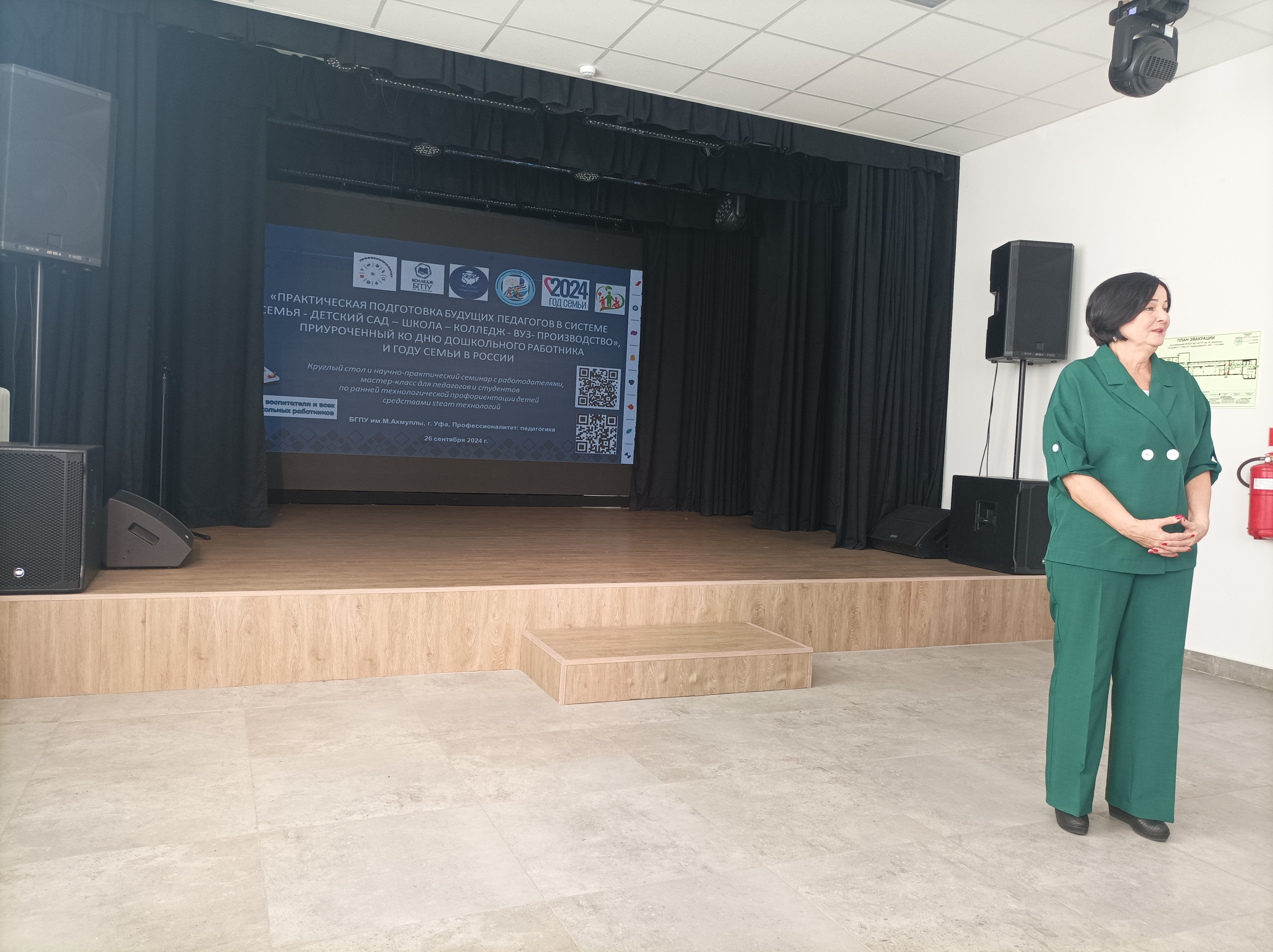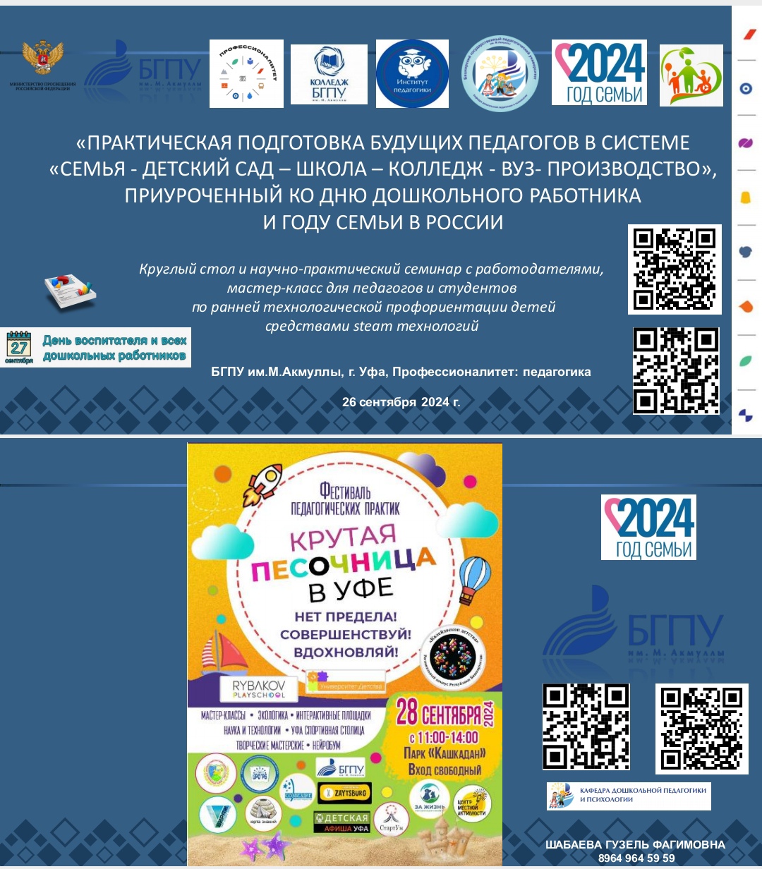 26-27 сентября 2024 г. Взаимодействие Колледж БГПУ им.М.Акмуллы и Институт педагогики Акмуллинского университета: круглый стол, научно-методический семинар-сессия, мастер-класс по steam по инженерным профессиям.  Круглый стол "ПРАКТИЧЕСКАЯ ПОДГОТОВКА БУДУЩИХ ПЕДАГОГОВ В СИСТЕМЕ  «СЕМЬЯ - ДЕТСКИЙ САД – ШКОЛА – КОЛЛЕДЖ - ВУЗ- ПРОИЗВОДСТВО», ПРИУРОЧЕННЫЙ КО ДНЮ ДОШКОЛЬНОГО РАБОТНИКА И ГОДУ СЕМЬИ В РОССИИ