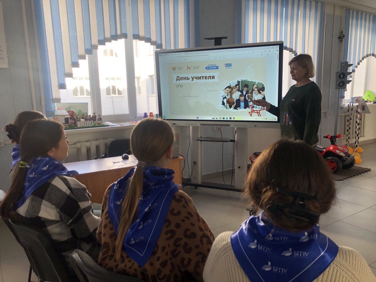 30 сентября 2024 года в рамках просветительских мероприятий Всероссийского проекта «Разговоры о важном!» для студентов, обучающихся по направлению «Педагогическое образование», профиль подготовки «Дошкольное образование» проведен тематический урок: «День учителя». Это общий праздник, праздник всех поколений, благодарных за полученные знания и умения, за воспитание. Сегодня мы говорили о важности труда педагога, почетной профессии. Отметили, что педагоги дают не только знания, но и проводят воспитательную работу, которая влияет на становление будущей личности. У каждого из нас есть пример педагога, образ которого бережно храним всю жизнь. Рассказывая уже своим ученикам, студентам, что труд педагога заслуживает глубокого признания и благодарности. Ведь именно он открывает много нового и интересного, учит нужным и полезным навыкам, помогает ориентироваться в нынешнем мире.