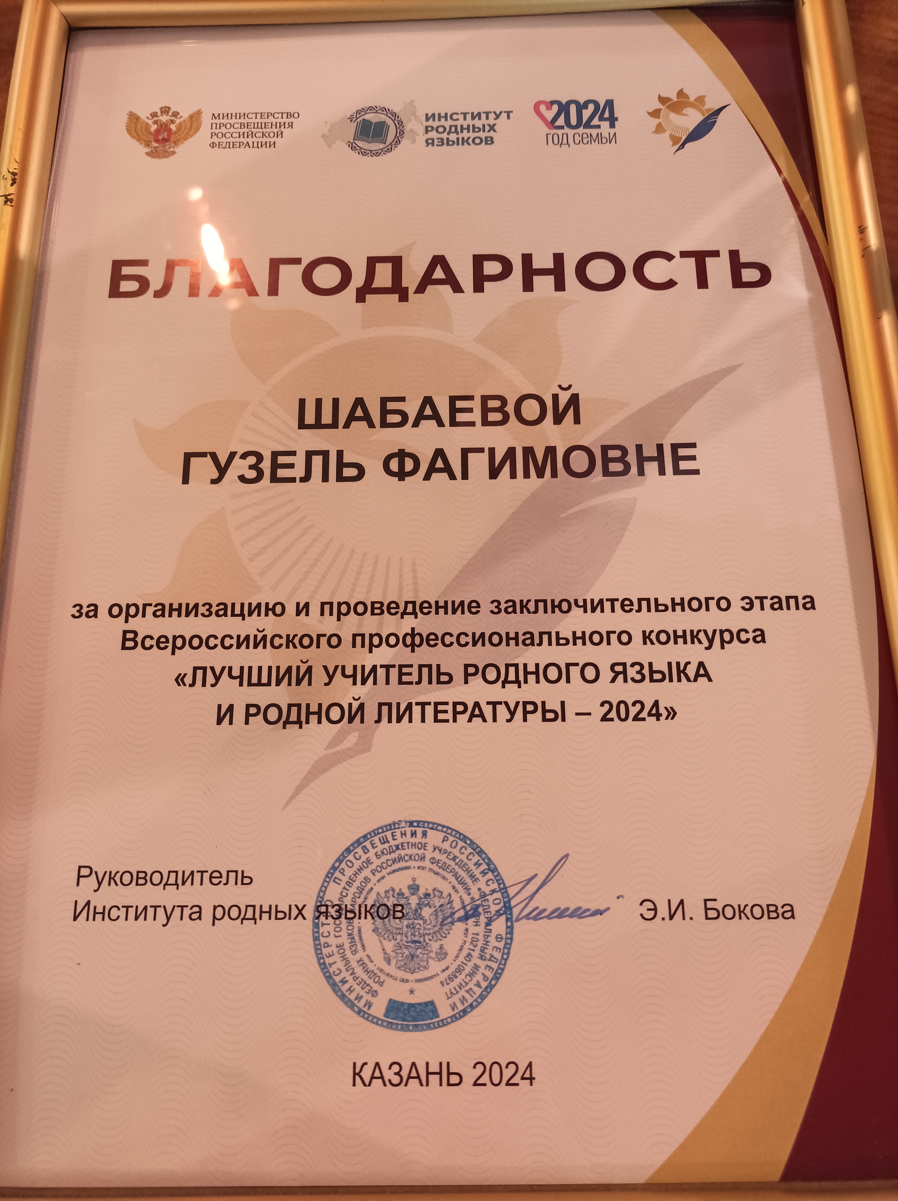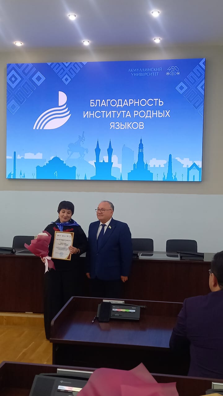 вручено благодарственное письмо Министерства просвещения Российской Федерации Федерального института родных языков за активное участие в организации и проведении Всероссийского профессионального конкурса «Лучший учитель родного языка и литературы», который прошел в Казани в сентябре 2024 года.