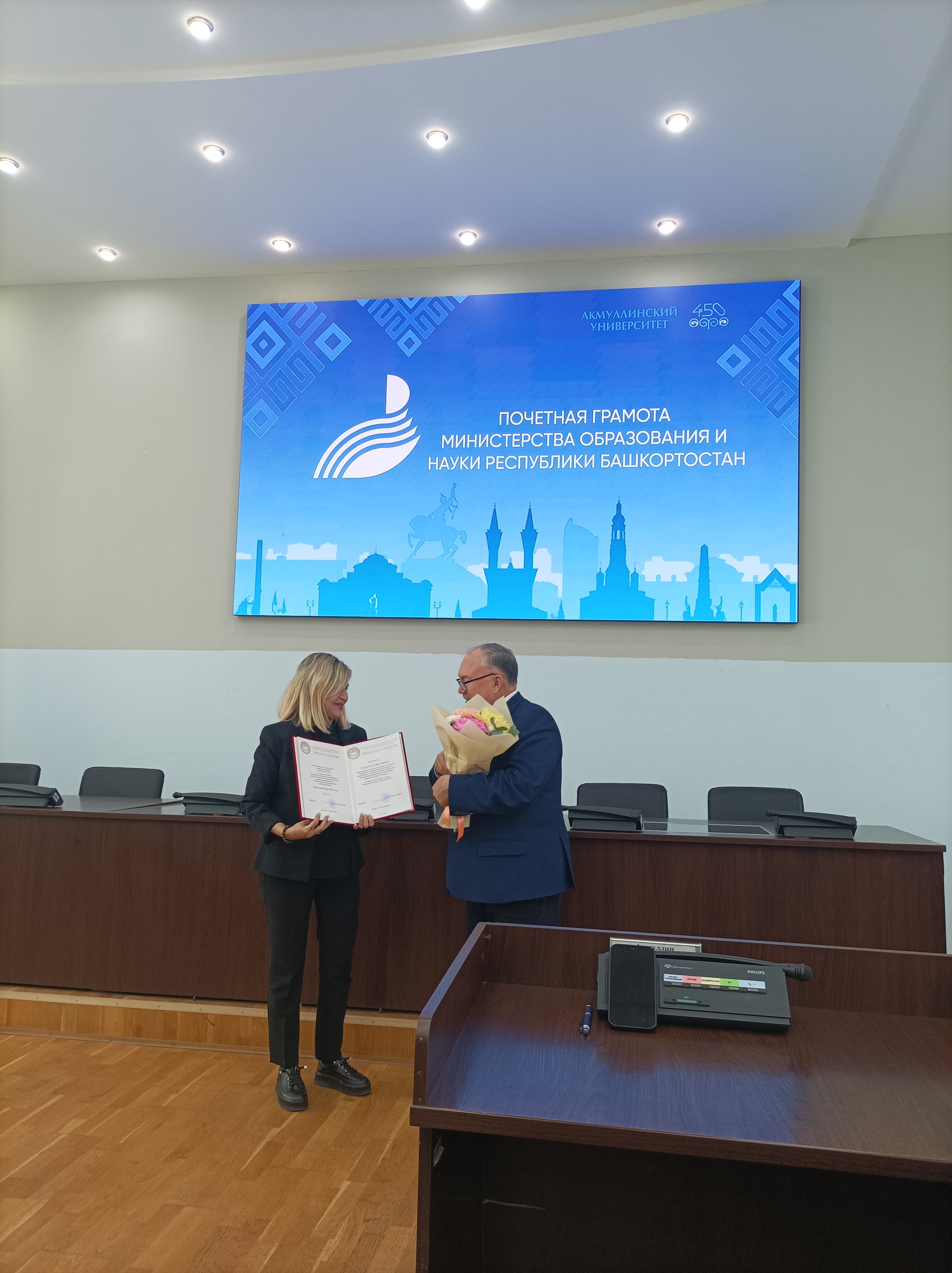 09.10.2024г. Акчулпанова Альфия Ануровна к.п.н.,доцент кафедры дошкольной педагогики и психологии была награждена Почетной грамотой Министерства образования и науки Республики Башкортостан за Добросовестный труд в системе образования Республики Башкортостан