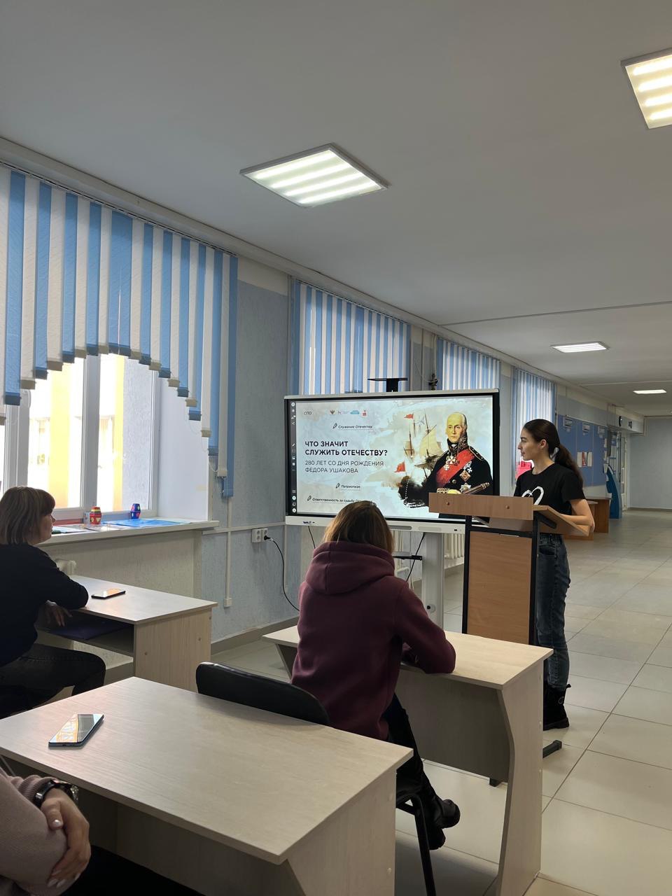 17 февраля 2025 года в рамках просветительских мероприятий Всероссийского проекта «Разговоры о важном!» для студентов, обучающихся по направлению «Педагогическое образование», профиль подготовки «Дошкольное образование» проведен тематический урок: «Что значит служить Отечеству? 280 лет со дня рождения Ф. Ушакова». Сегодня мы говорили о мужестве, долге и чести, вспомнили имена тех, кто навсегда вошел в историю страны: адмирала Фёдора Ушакова и святого Патриарха Тихона, какие морские сражения под его командованием стали наиболее значимыми для России. Особый интерес вызвал видеоролик (интервью) с Евгением Поддубным, интерактивные задания, показывающие огромный вклад в развитие морского флота и значение подвигов. Мы согласны с утверждением, что любовь к Родине и ответственность за ее судьбу — это основополагающие ценности российского общества, наши общие ценности.