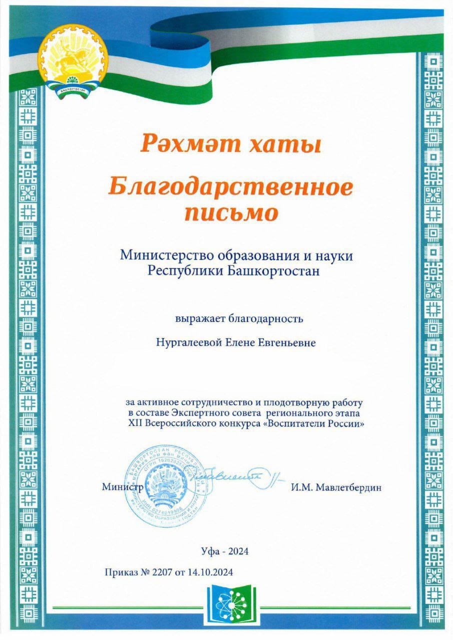 Нургалеева Елена Евгеньевна получила БЛАГОДАРСТВЕННОЕ ПИСЬМО Министерства образования и науки Республики Башкортостан  за активное сотрудничество и плодотворную работу в  экспертном совете регионального этапа XII Всероссийского конкурса «ВОСПИТАТЕЛИ РОССИИ»
