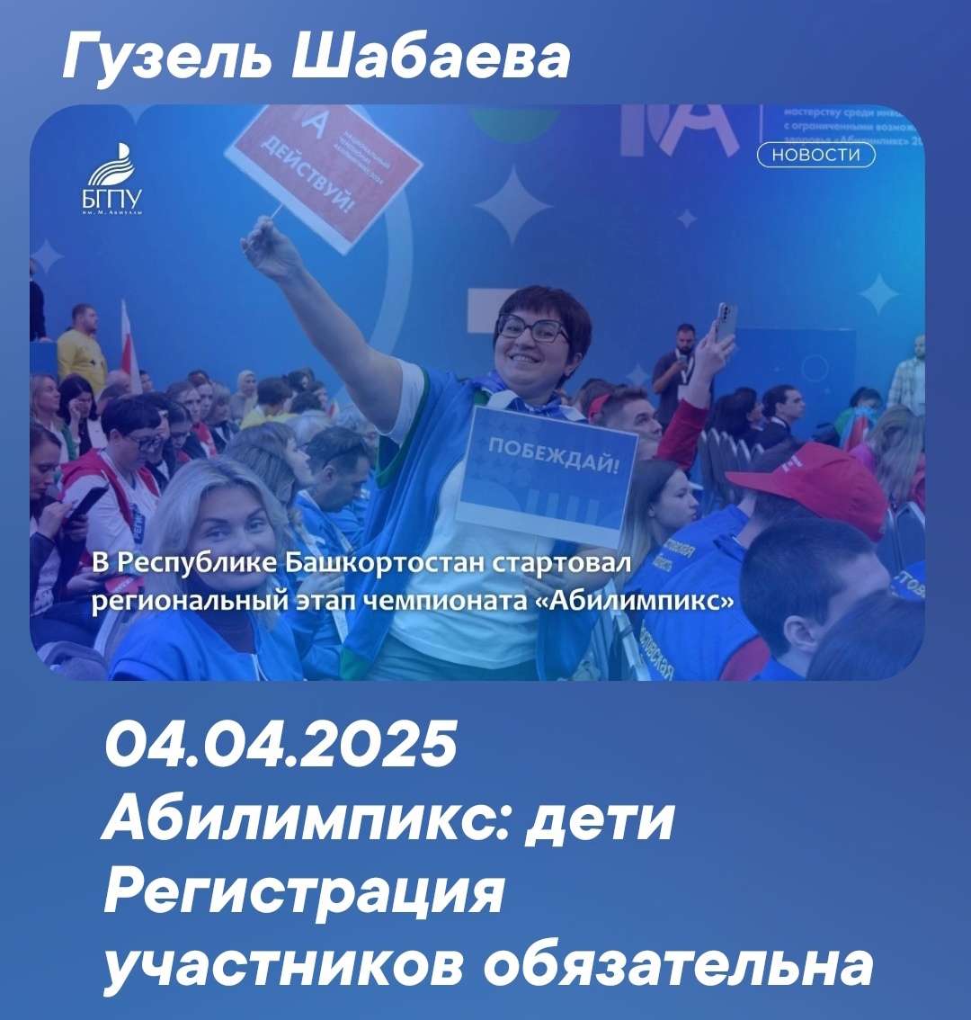 В рамках деловой программы чемпионата 04.04.2025г. пройдет конкурс ранней профессиональной ориентации среди детей дошкольного и младшего школьного  возраста с ограниченными возможностями здоровья. Это совместный проект БГПУ им. М. Акмуллы и Регионального центра развития движения «Абилимпикс» в Республике Башкортостан.