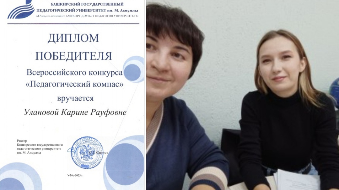 В соответствии с Положением о проведении Всероссийского конкурса "Педагогический компас", утверждённым приказом №124/о от 30.01.2025 г. «Об утверждении и введении в действие Положений», Карина Рауфовна награждена дипломом ПОБЕДИТЕЛЯ конкурса среди педагогических работников образовательных организаций всех видов и типов, организованном на базе федерального государственного бюджетного образовательного учреждения высшего образования «Башкирский государственный педагогический университет им. М. Акмуллы».