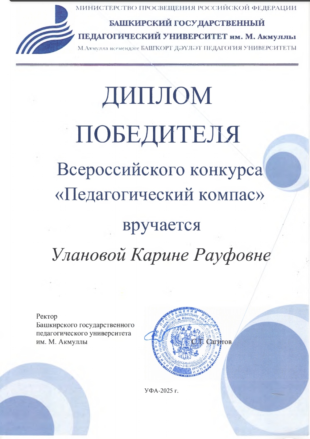 Уланова Карина Рауфовна – победитель Всероссийского конкурса «Педагогический компас»