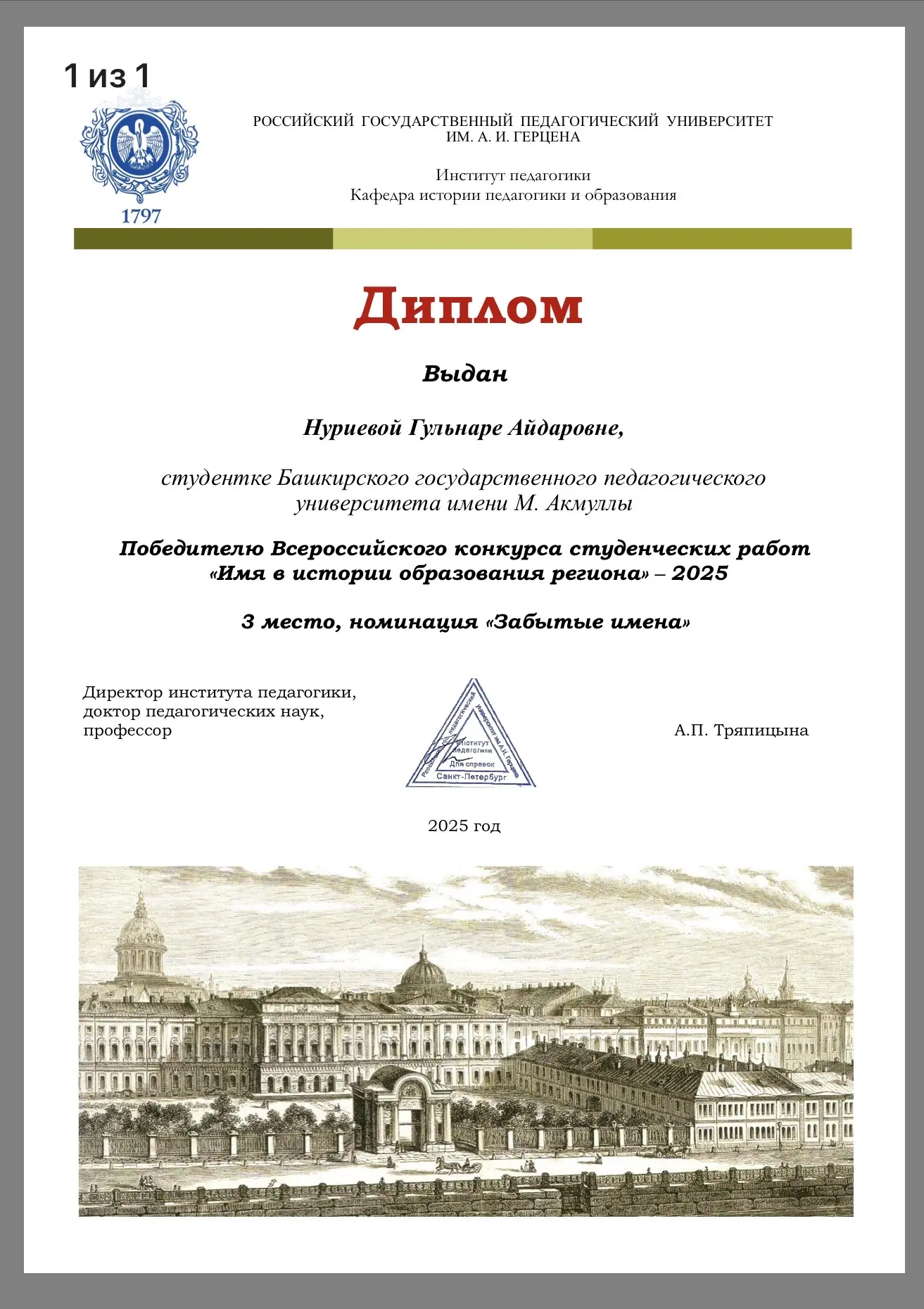 В рамках сотрудничества РГПУ им. А. И. Герцена и БГПУ им.М.Акмуллы студенты кафедры дошкольной педагогики и психологии приняли участие во Всероссийском конкурсе студенческих работ «ИМЯ в истории образования региона».