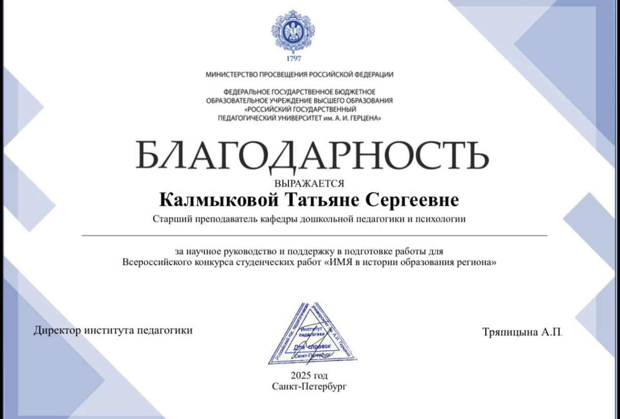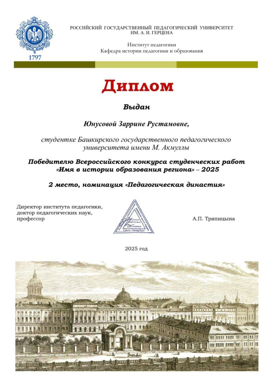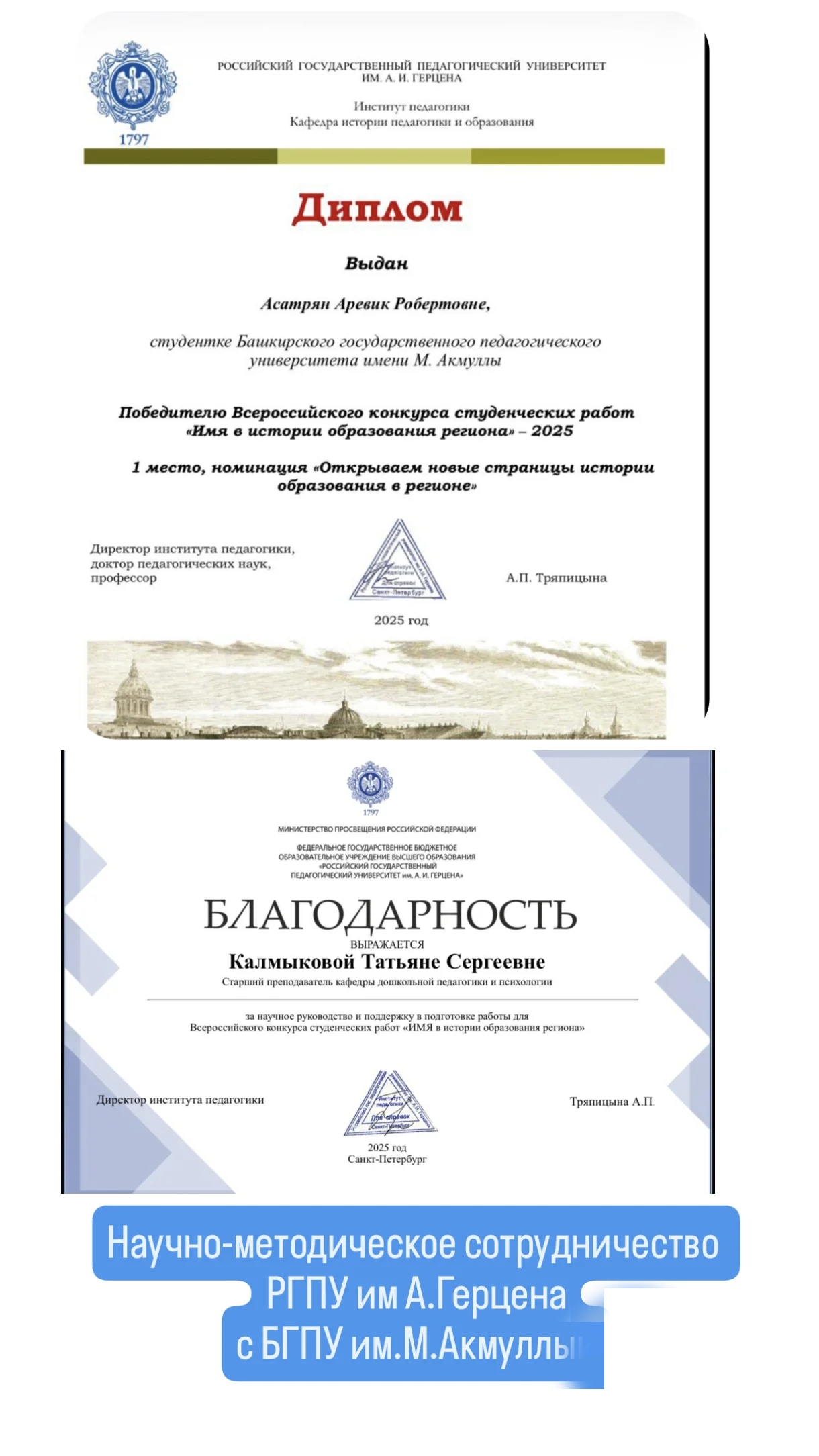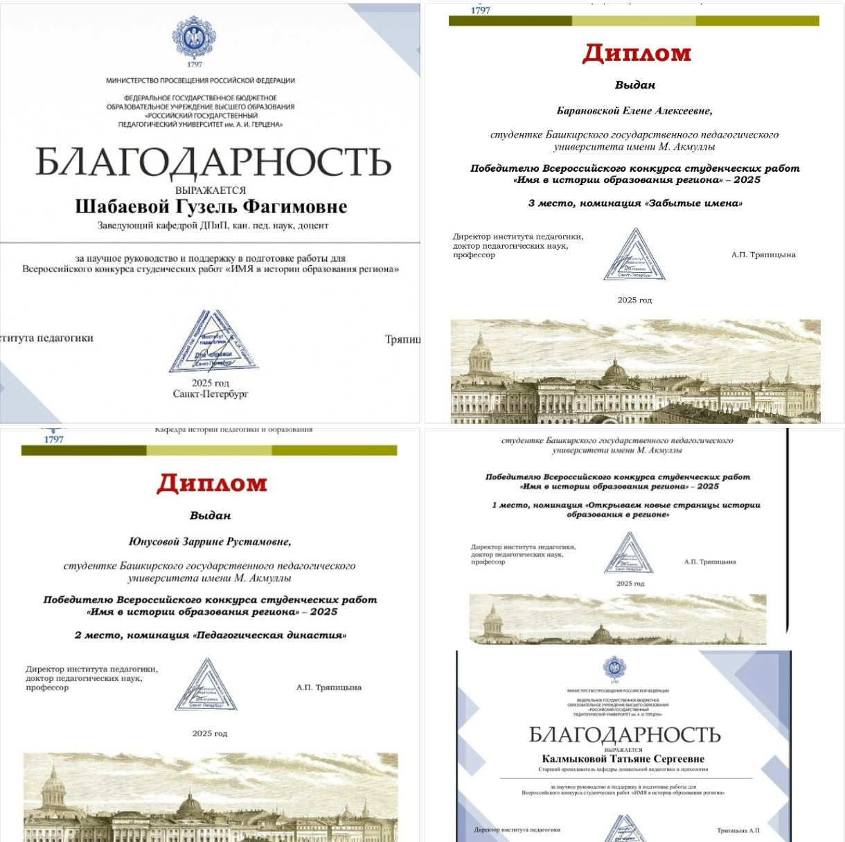 «Защитника отечества РФ», «115-летия со дня рождения М. Монтессори», 10-летия детства в РФ, Технологизации в РФ в условиях научно-методического взаимодействия и сотрудничества РГПУ им.А.Герцена и БГПУ имени Мифтахетдина Акмуллы студенты и ППС кафедры ДПиП Института педагогики приняли активное участие во Всероссийском конкурсе студенческих работ "Имя в истории образования региона - 2025», организованный Институтом педагогики Российского Государственного Педагогического Университета им. А.И. Герцена.