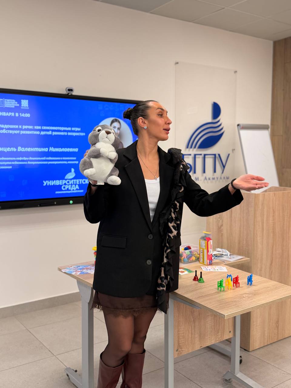 Особый интерес у гостей вызвал второй блок — интерактивный мастер-класс «От ладошки к речи: как сенсомоторные игры способствуют развитию детей раннего возраста». Это был не просто рассказ о профессии, а живая демонстрация её творческой и научной составляющей. Валентина Николаевна Кинцель объяснила, что сенсомоторное развитие — это база, на которой строится всё дальнейшее познание мира ребёнком. Студентки Виктория и Владислава наглядно показали, какие простые, но эффективные упражнения можно использовать как в детском саду, так и дома.