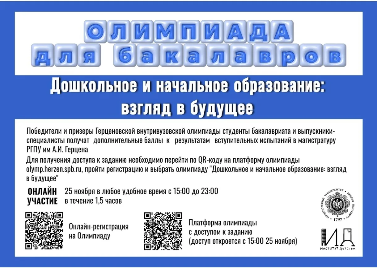 Информация: результаты дипломантов (победителей) Герценовской внутривузовской олимпиады учитываются в качестве индивидуальных достижений при поступлении на программы магистратуры в РГПУ им. А. И. Герцена в соответствии с действующими правилами приема в университет.