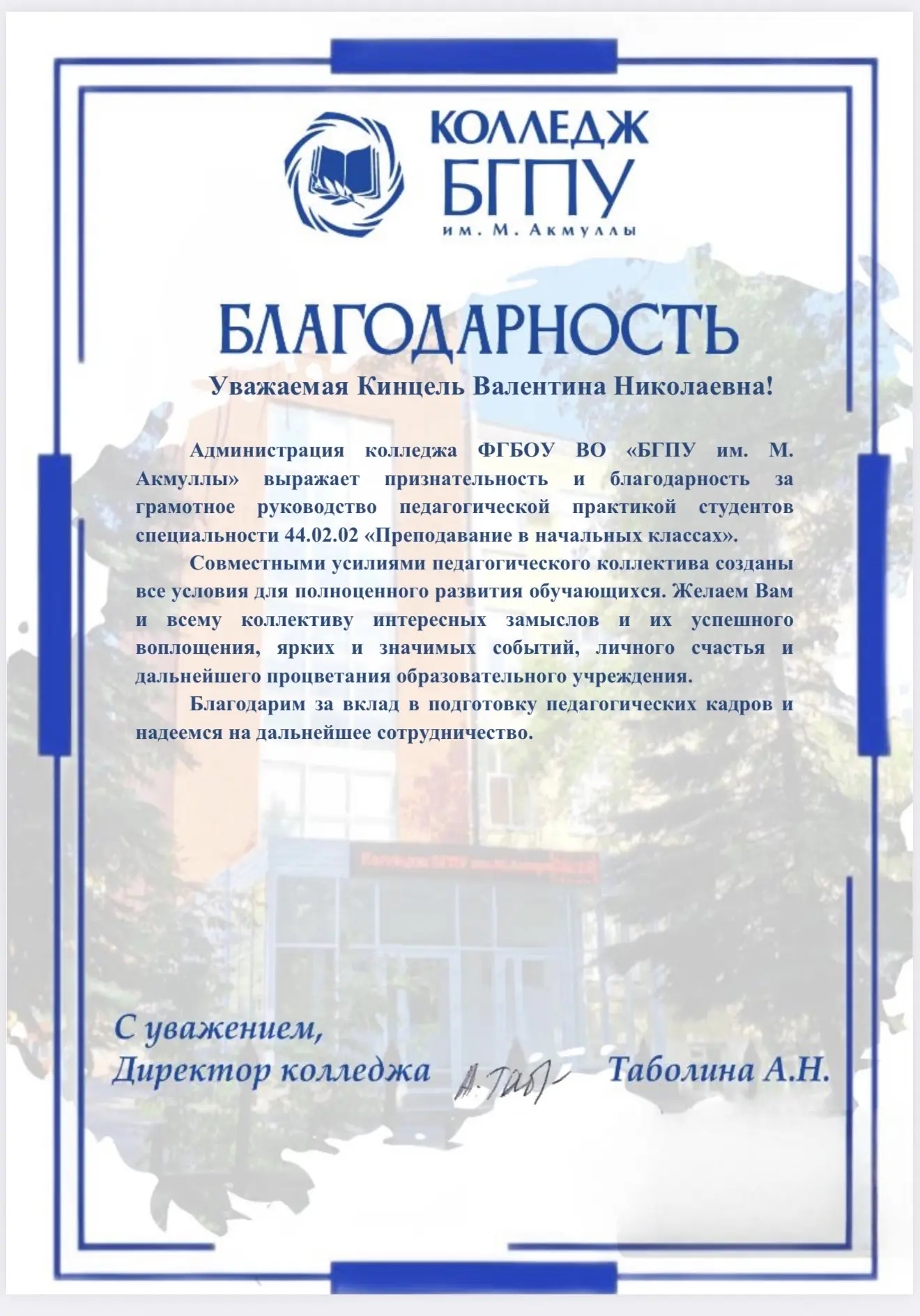 Согласно полученной благодарности, подписанной директором колледжа А.Н. Таболиной, Кинцель В.Н. проявила себя как компетентный наставник при руководстве педагогической практикой студентов специальности 44.02.02 «Преподавание в начальных классах».