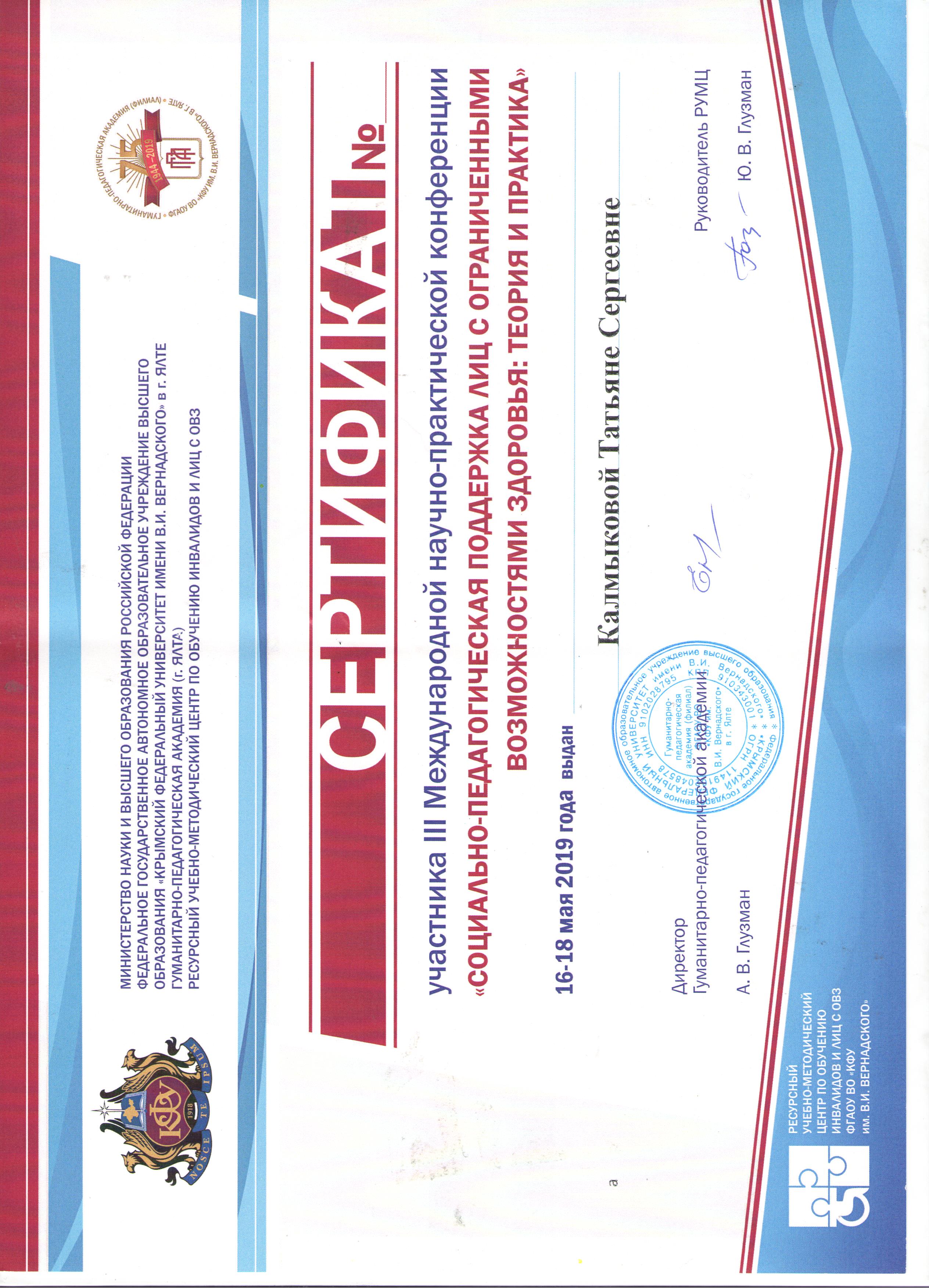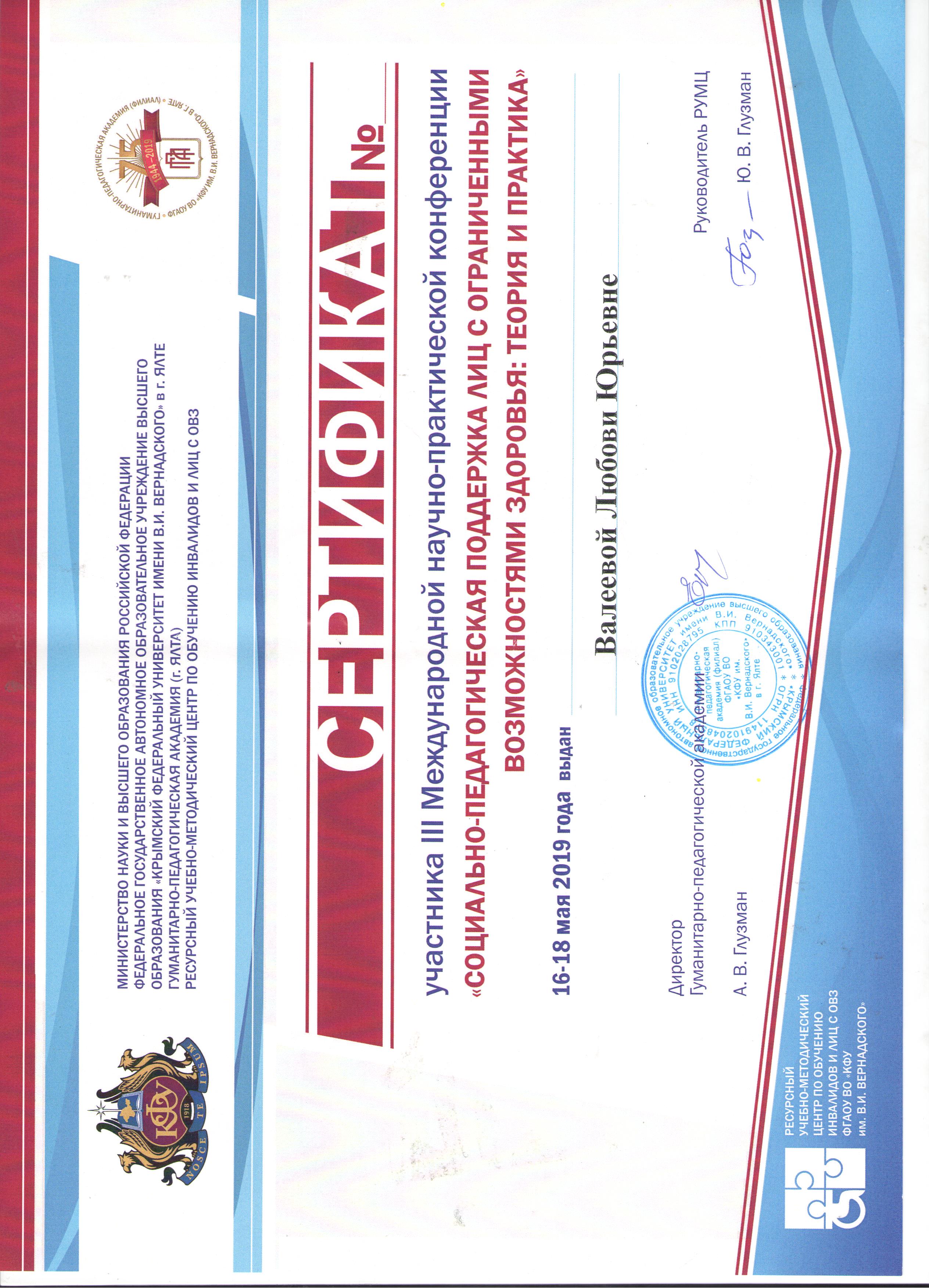 Преподаватель кафедры ДПиП Л.Ю. Валеева и преподаватель Колледж БГПУ им.М.Акмуллы Т.С. Калмыкова приняли очное участие в г. Ялта Респ. Крым 16-18 мая 2019 года в работе III Международной научно-практической конференции «Социально-педагогическая поддержка лиц с ограниченными возможностями здоровья: теория и практика». В мероприятии приняли участие представители более 80 университетов, более 30 дошкольных образовательных организаций и 20 специализированных учреждений.