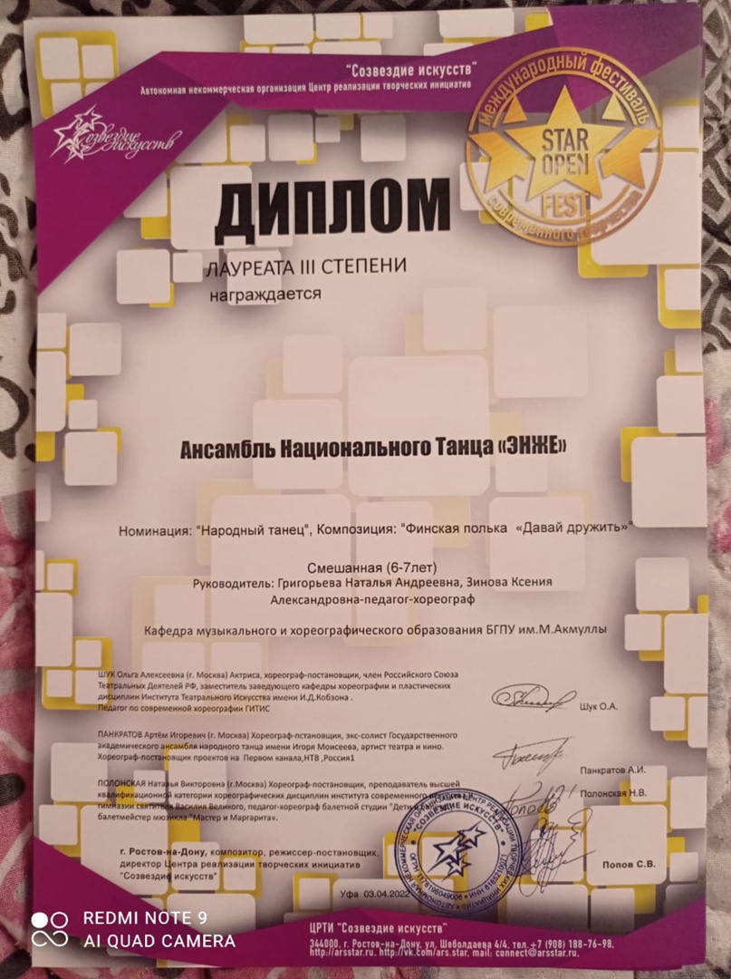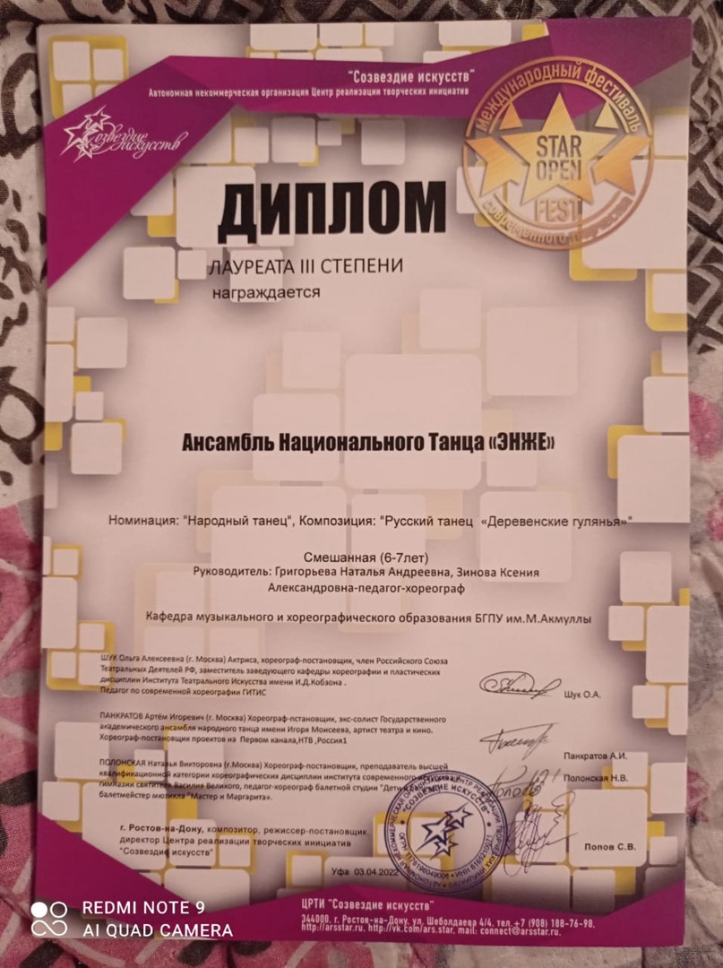 3 апреля 2022г. Ансамбль Национального Танца «ЭНЖЕ» принял участие в III Международном хореографическом фестивале-конкурсе "Star Open Fest", который проходил в Городском Дворце Культуры г.Уфа.