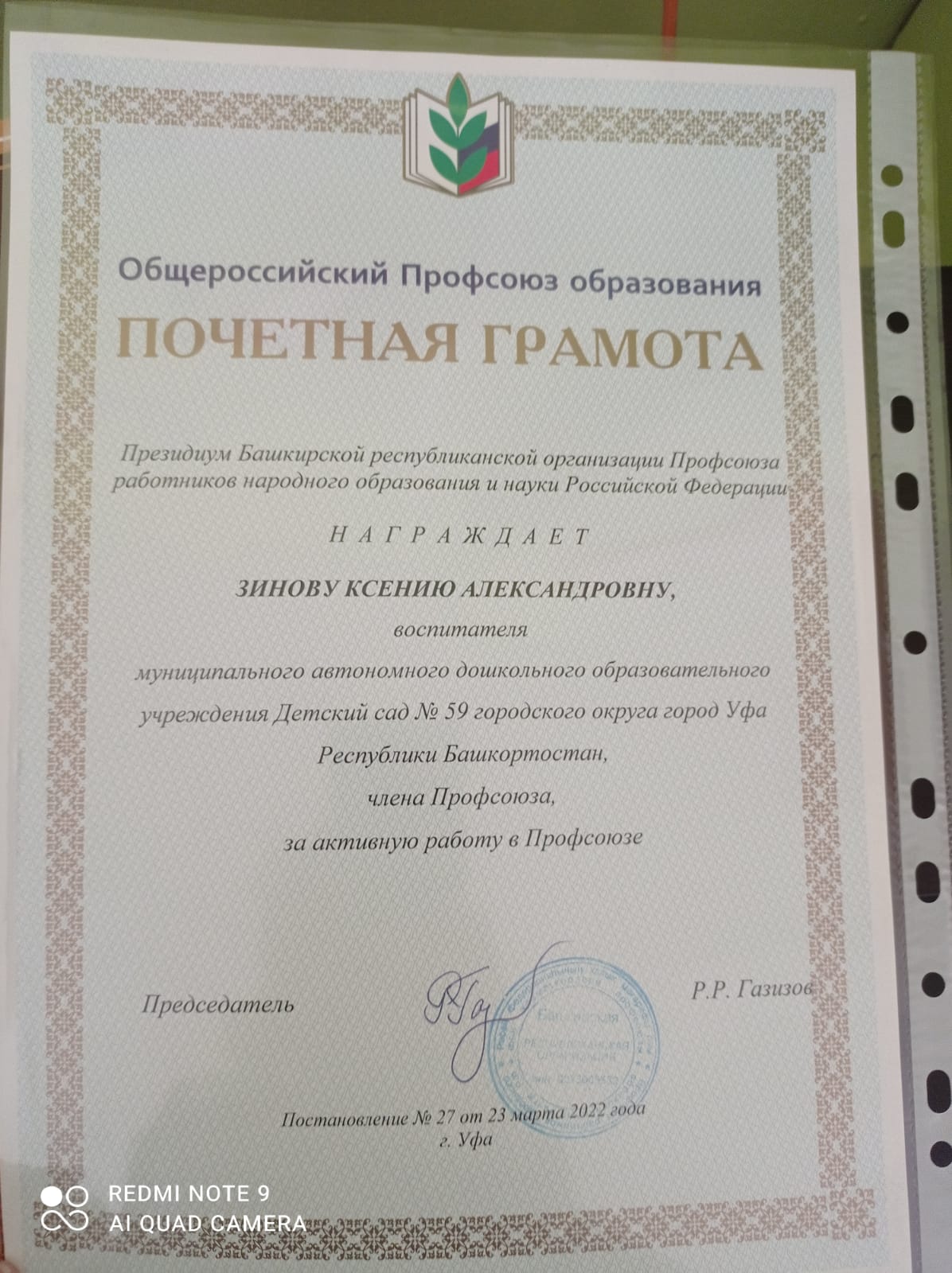 В Ансамбле Национального Танца "ЭНЖЕ" работает профессиональный человек, педагог-хореограф Зинова Ксения Александровна! Администрация Калининского района городского округа город Уфа Республики Башкортостан наградила Зинову Ксению Александровну Почетной грамотой за плодотворный труд в системе образования, вклад в обучение и воспитание подрастающего поколения. Общероссийский Профсоюз образования так же наградил Почетной грамотой за активную работу в Профсоюзе.