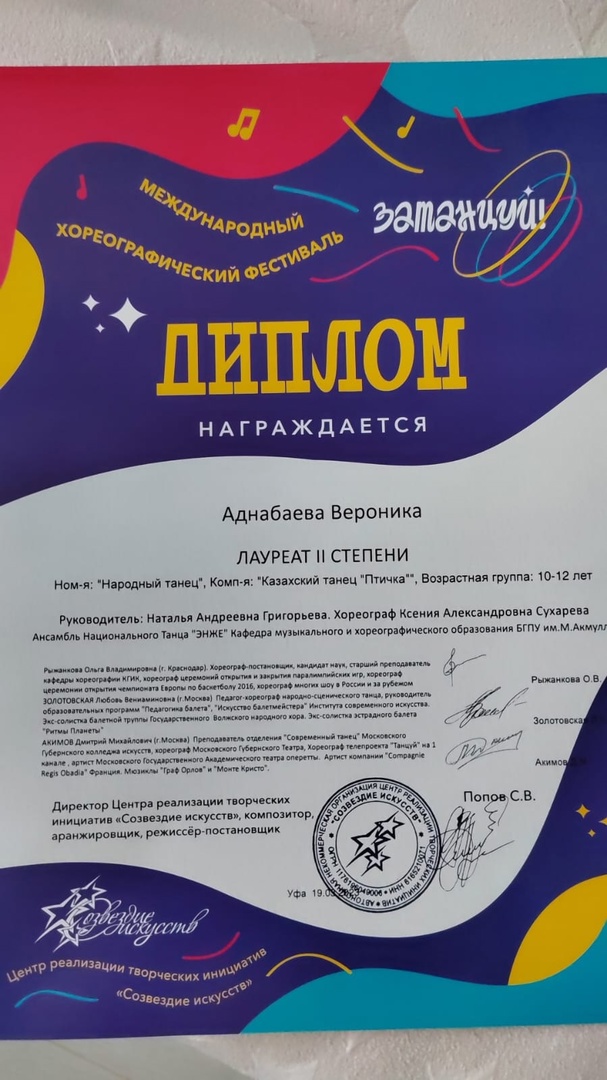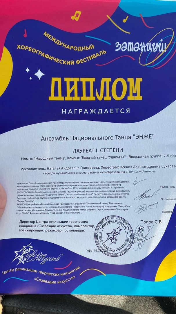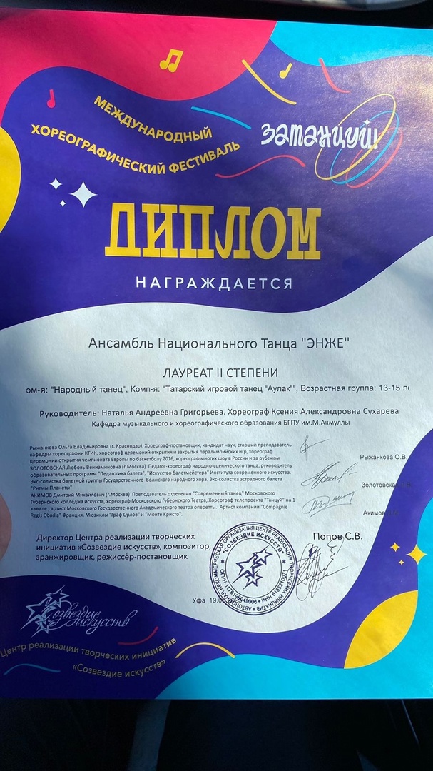 19 марта в г. Уфа состоялся Международный хореографический конкурс «Затанцуй». Ансамбль Национального Танца "ЭНЖЕ" стал участником этого события и завоевал призовые места. Жюри было строгим и справедливым, мнения их очень важно для нас, начинаешь задумываться и стремишься к лучшему. Продолжаем работать и творить, а впереди нас ждёт конкурс в Казани, ещё одно испытание для ЭНЖЕ!)