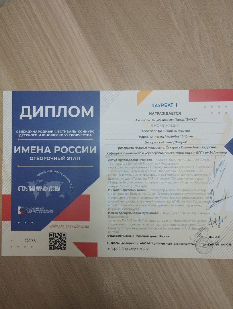 3 декабря старшая группа Вихрь Ансамбля ЭНЖЕ стала участником Международного фестиваля детского и юношеского творчества «Имена России». на сцене ДК ""Атайсал"и становится Лауреатом 1 степени (белорусский танец "Кивуха") и Лауреатом 2 степени Вероника Аднабаева, соло (башкирский танец "Журавушка").