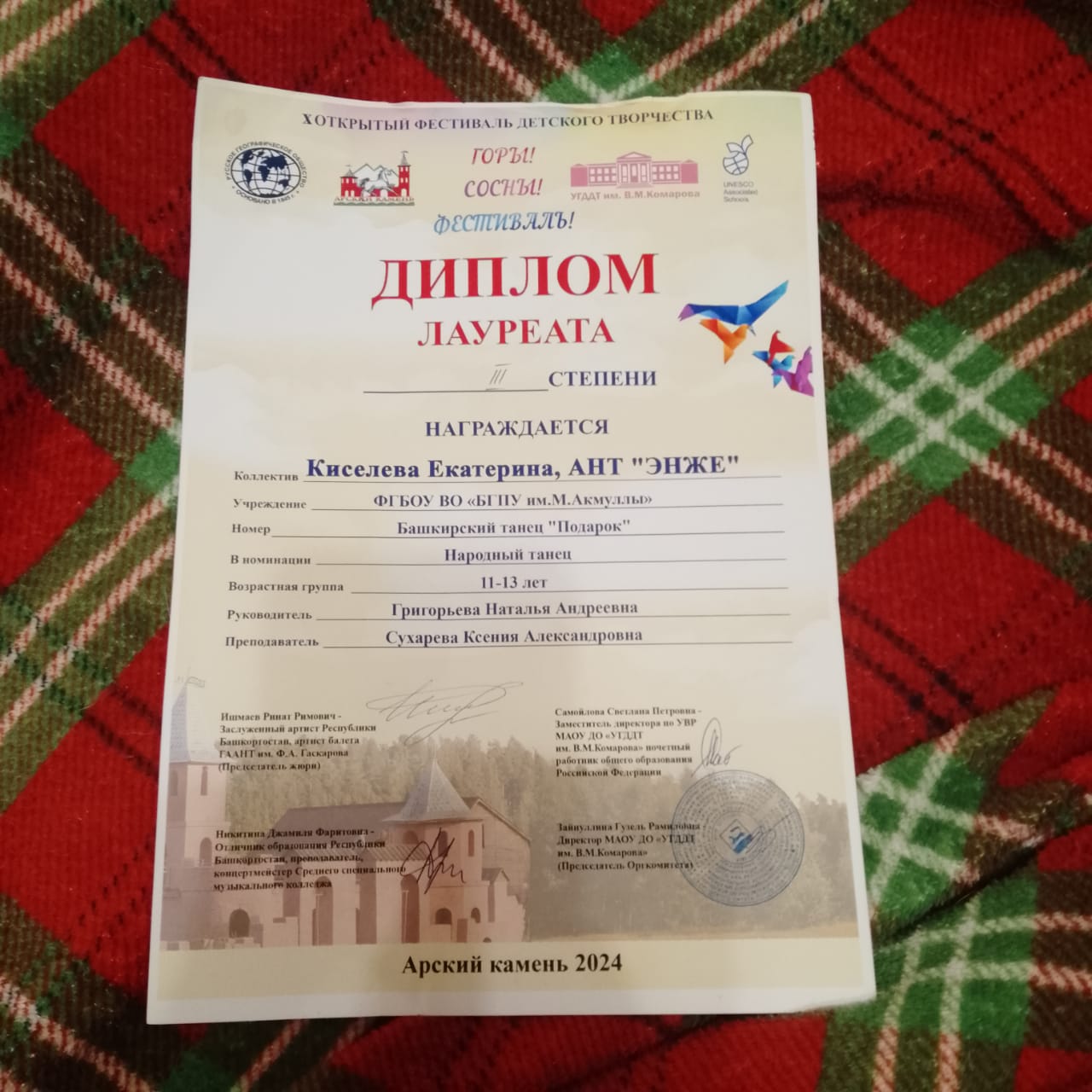 5.Башкирский танец «Подарок», Киселева Екатерина (13 лет, соло) - Лауреат 3 степени.