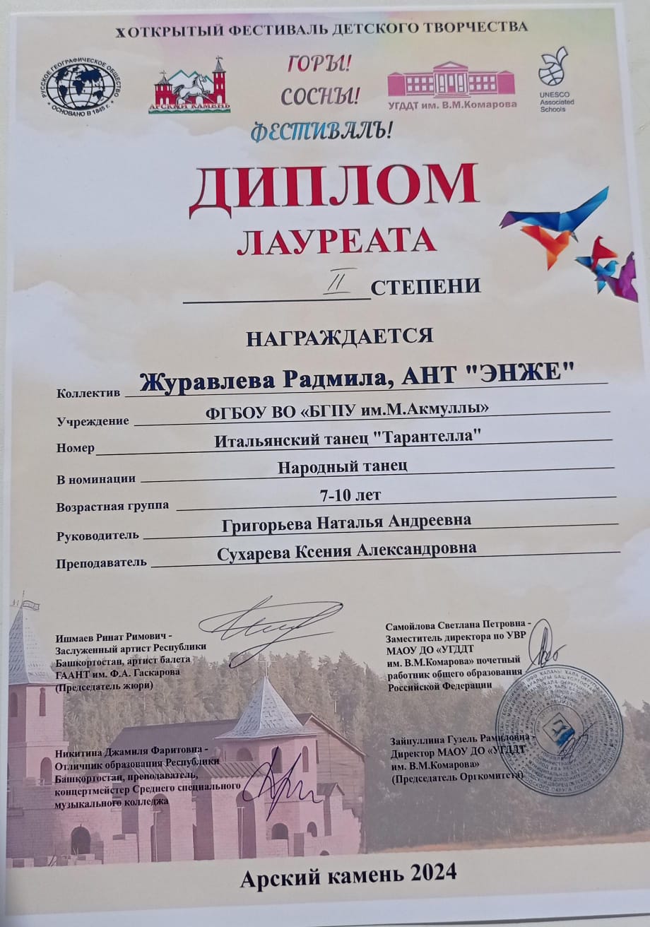 С 28 апреля по 1 мая Ансамбль Национального Танца "ЭНЖЕ" принял участие в фестивале-конкурсе "Горы! Сосны! Фестиваль!", который прошел на базе отдыха «Арский камень» (Белорецкий район РБ), расположенной в самом центре горной части Южного Урала, неподалеку от истоков красавицы Белой – главной реки Башкортостана. База отдыха с трех сторон окружена изгибом Белой, а с четвертой вплотную подступает густой сосновый бор. В программу фестиваля вошли конкурсные выступления, досуговая программа, экскурсии, пешие прогулки по живописным окрестностям, к памятникам природы и историческим местам. Организаторы Фестиваля – МАОУ ДО «Уфимский городской Дворец детского творчества им. В.М. Комарова», Комитет Республики Башкортостан по делам ЮНЕСКО, Региональное отделение Русского географического общества в Республике Башкортостан. Основная идея Фестиваля – уникальная природа родного края как источник творческого развития, патриотического воспитания и оздоровления детей.