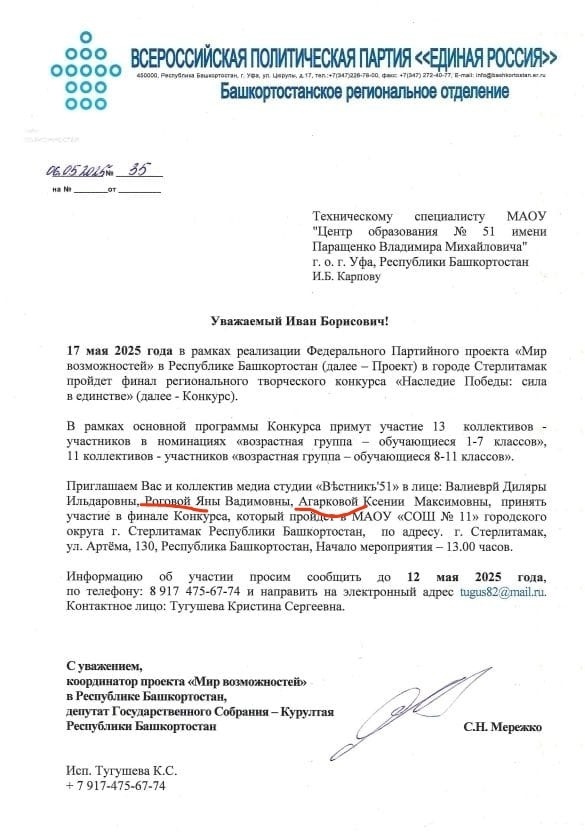 17 мая в Стерлитамаке прошел финал регионального творческого конкурса "Наследие Победы: сила в единстве" в рамках партийного проекта "Мир возможностей". Организатором выступила Всероссийская политическая партия "Единая Россия", а координатором в Башкирии стал депутат Госсобрания – Курултая республики С.Н.Мережко.