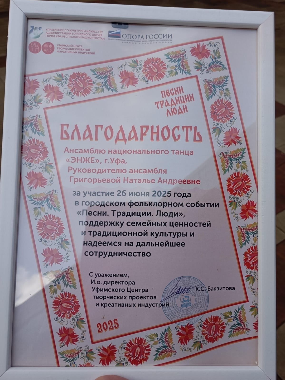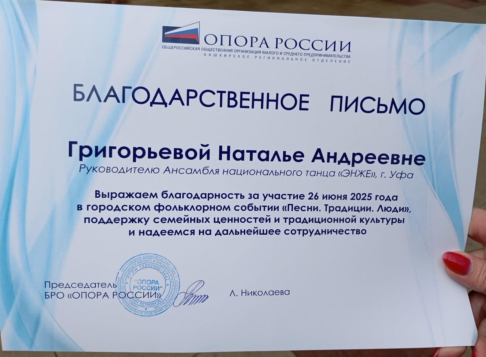 26 июня Башкирским региональным отделением «ОПОРА РОССИИ» при поддержке Управления по культуре и искусству Администрации городского округа город Уфа, Уфимского центра творческих проектов и креативных индустрий в саду им. С.Т. Аксакова организован вечер народного творчества памяти известного фольклориста Брянцевой Людмилы Ивановны - Фестиваль «Песни. Традиции. Люди».