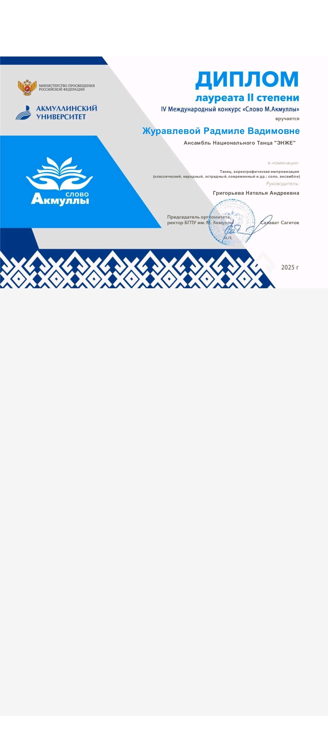 * Башкирский танец "Белый олень" (Журавлева Радмила) - Диплом лауреата II степени.