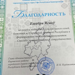 Ассистент кафедры тюркской и восточной филологии Ешбари Ясин получил благодарность от администрации Кировского района города Уфы