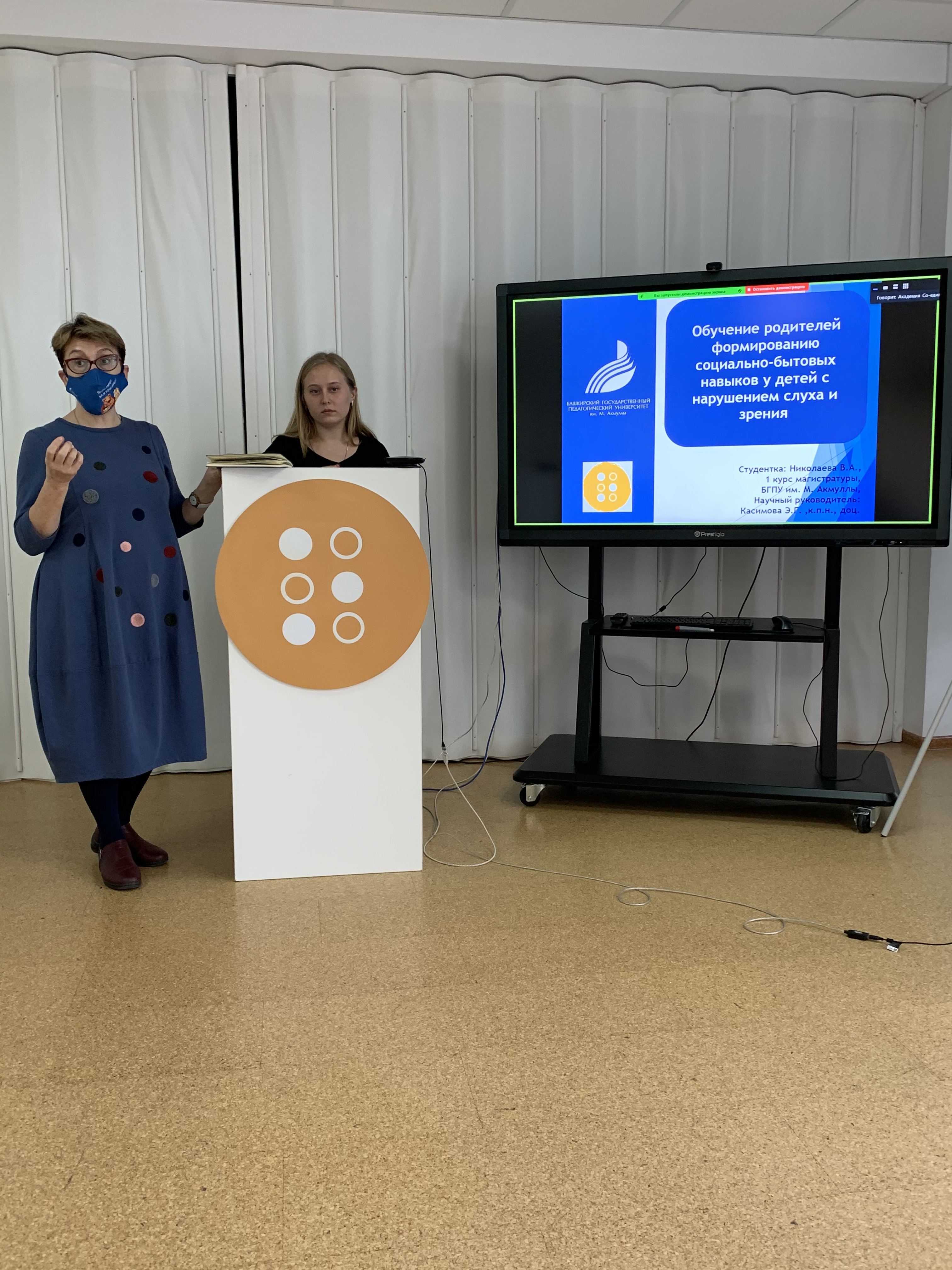 Студенты Института педагогики БГПУ им. И. Акмуллы в очередной раз приняли участие в проекте «Наставники и ученики» Фонда поддержки слепоглухих «Со-единение» и Ресурсного центра «Ясенева поляна». Преподаватели региональных вузов со своими студентами (бакалаврами, магистрами) и аспирантами обсуждали проблемы психолого-педагогического и социального сопровождения лиц с тяжелыми множественными нарушениями развития. Под руководством Э.Г. Касимовой, к.пед.н., доцента кафедры специальной педагогики и психологии студенты успешно представили свои проекты: Захарова К.С., бакалавр группы СОДД-31-18 на тему «Изучение особенностей сенсорного развития детей дошкольного возраста с нарушениями слуха и зрения», Николаева В. А., магистрант группы МПОМО-11-20 на тему: «Формирование социально-бытовых навыков у детей с нарушениями слуха и зрения в условиях семейного воспитания».