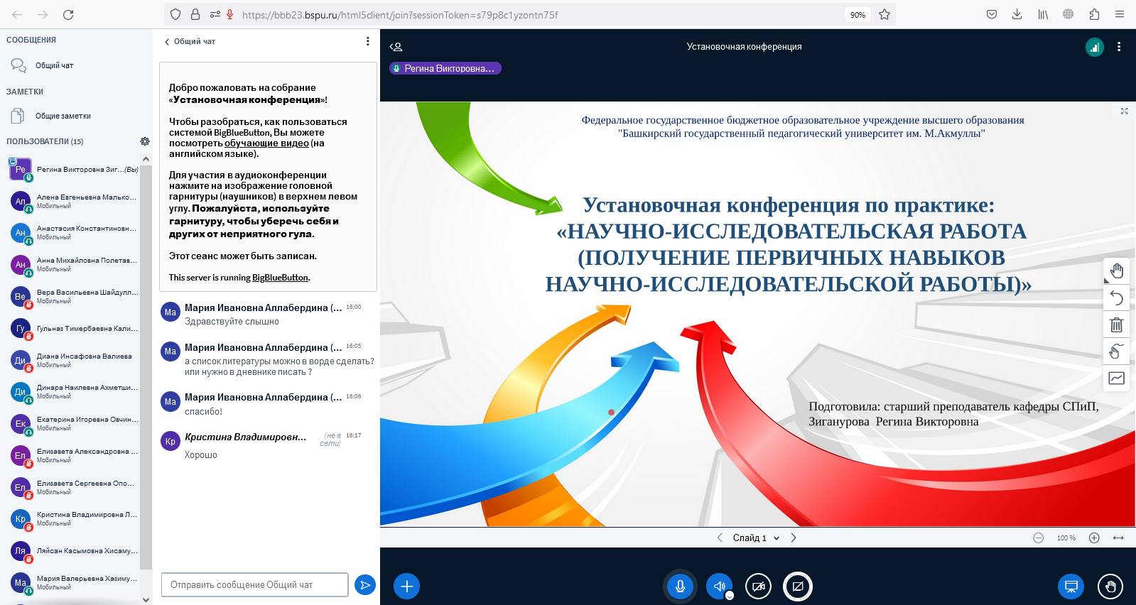• группа ЗСЛГС-21-21 (учебная практика по научно-исследовательской работе (получение первичных навыков научно-исследовательской работы) – 17 марта (на платформе СДО для студентов заочной формы обучения БГПУ им. М. Акмуллы).