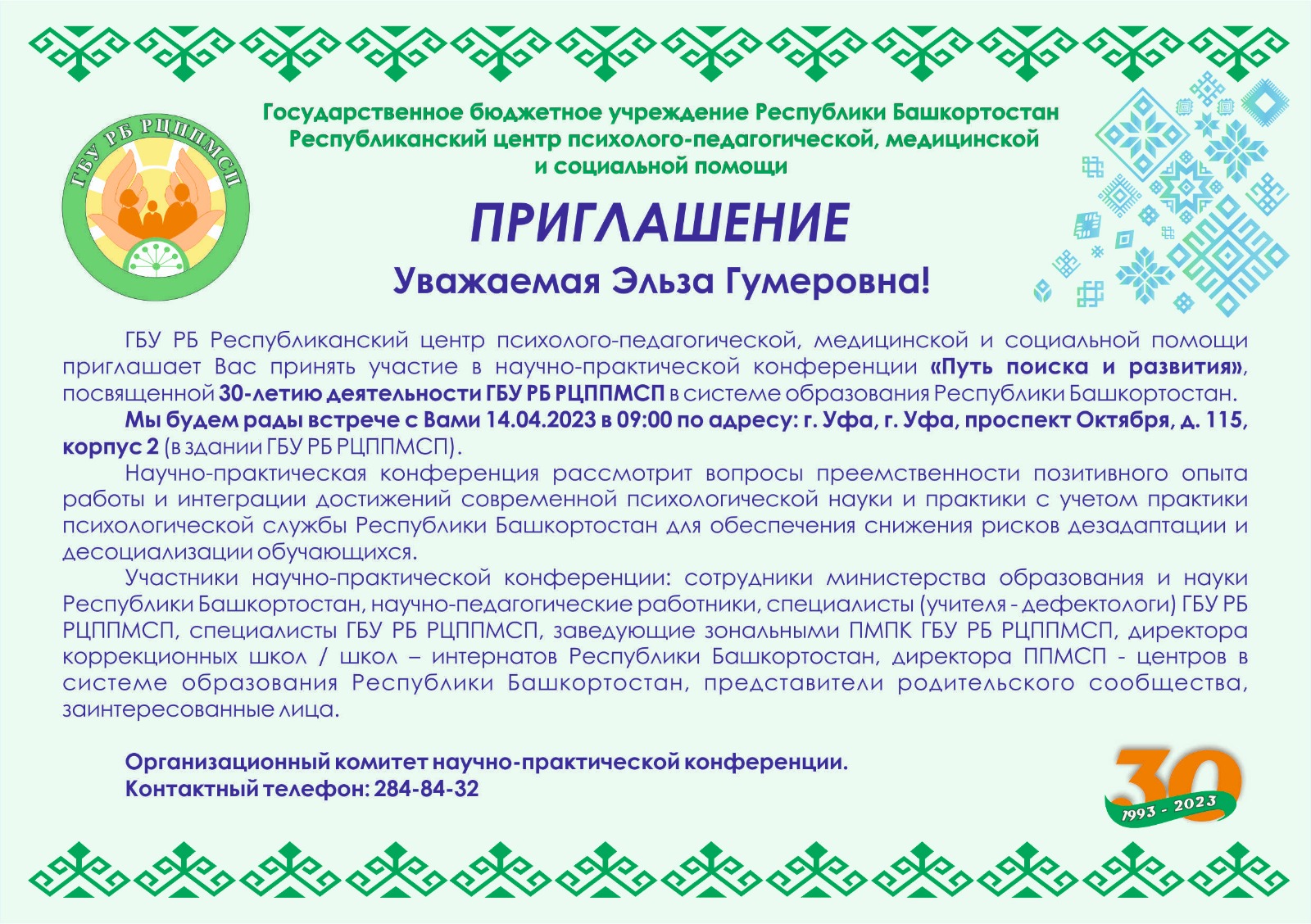 13-14 апреля 2023 года проходила научно-практическая конференция «Путь поиска и развития», посвященная 30-летию деятельности ГБУ РБ Республиканского центра психолого-педагогической, медицинской и социальной помощи.