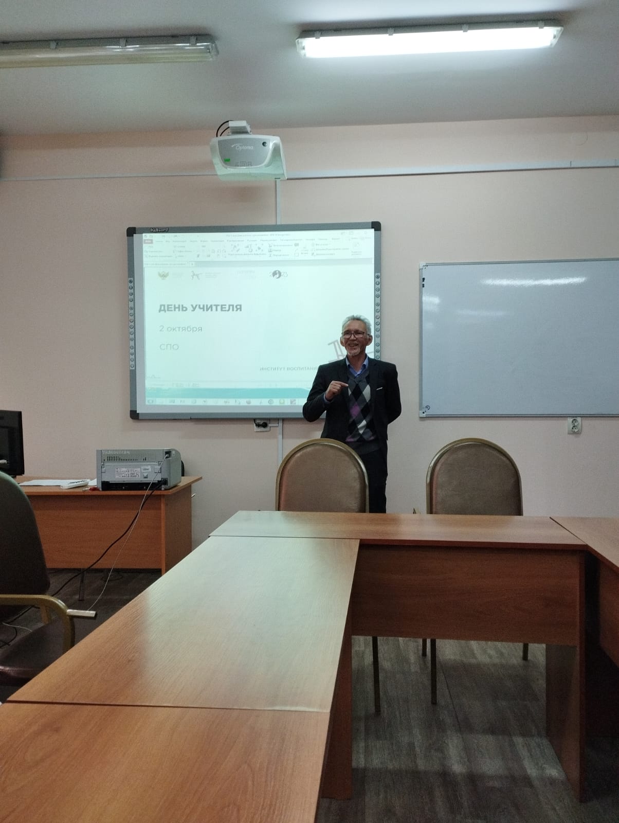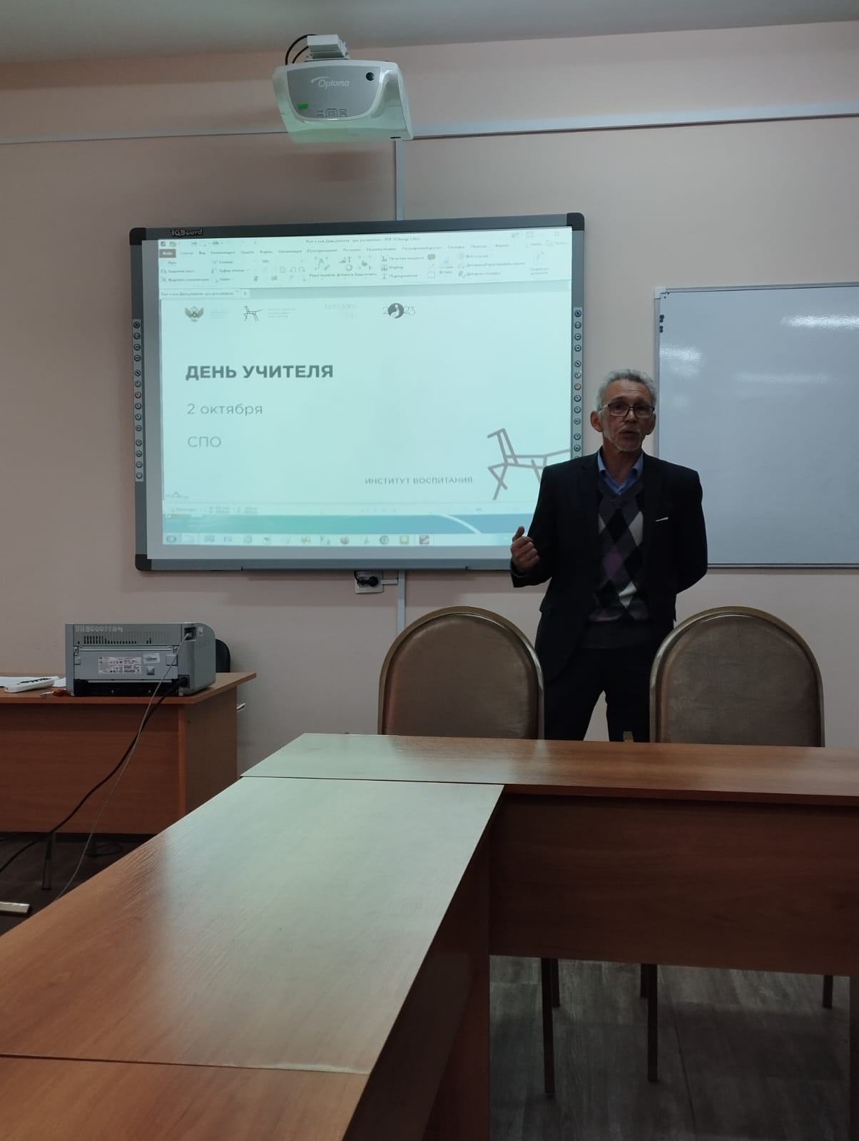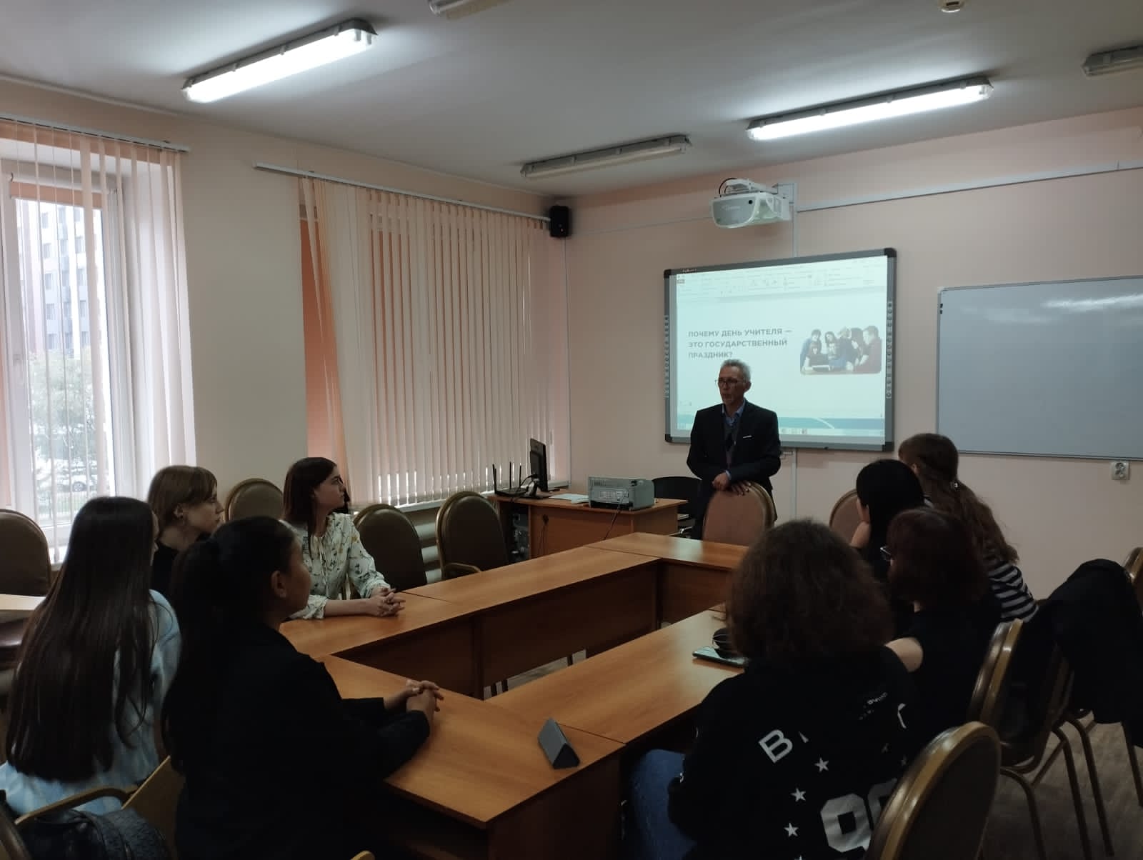 02 октября 2023 года со студентами групп СОЛОГ-11-23 и СОДД-11-23 в рамках проведения Разговора о важном состоялся кураторский час на тему «День учителя (советники по воспитанию)». Куратор Сайтханов А.Ф. обсудил со студентами вопросы истории педагогики, роли учителя и наставника в современном мире, социальной значимости профессии педагога.