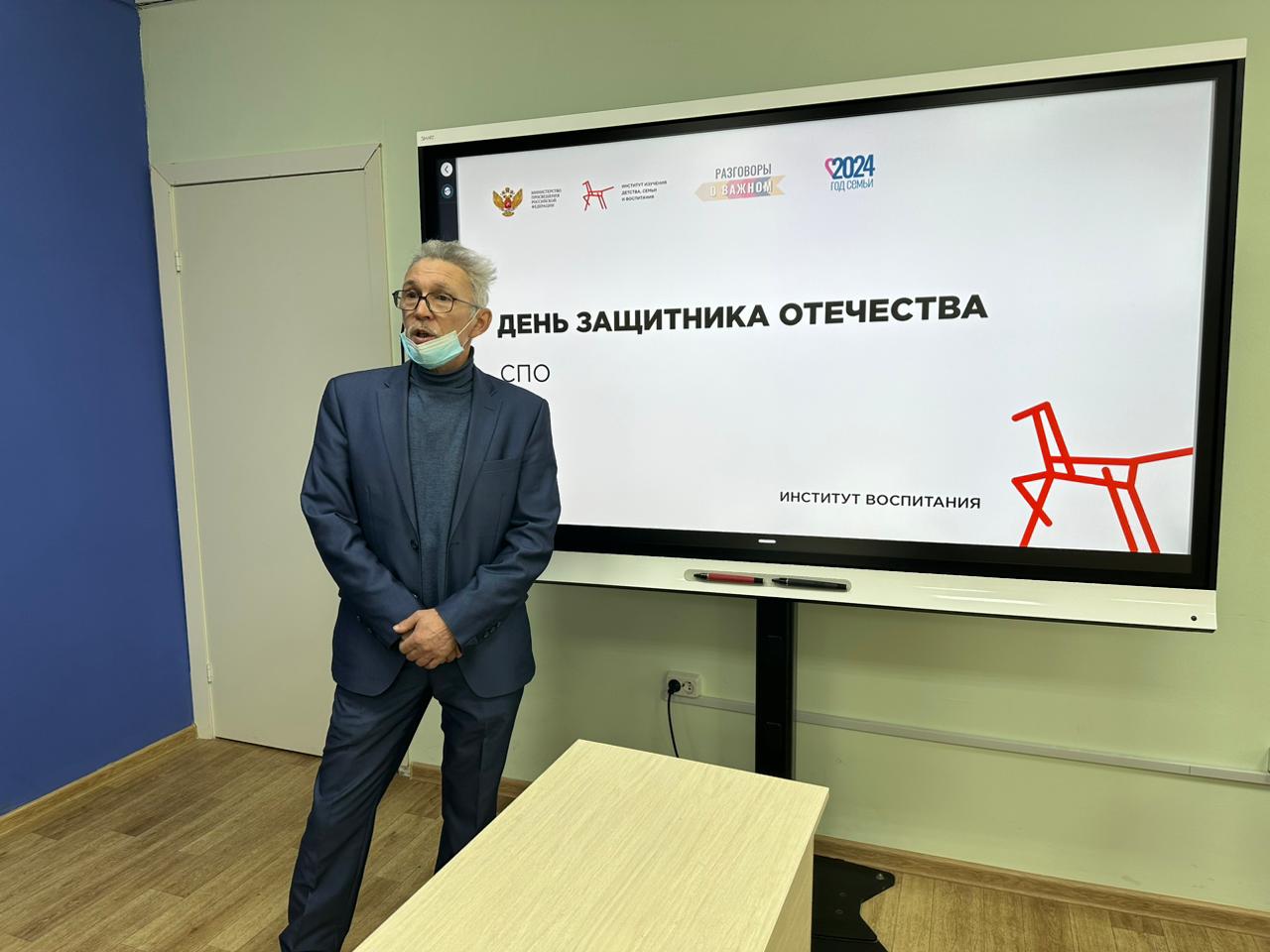 19 февраля  2024 года со студентами групп СОЛОГ-11-23 и СОДД-11-23 в рамках реализации проекта «РАЗГОВОРЫ О ВАЖНОМ» состоялся кураторский час на тему «День защитника Отечества» (куратор Сайтханов А.Ф.), на котором обсуждались вопросы сохранения памяти о наших героях в связи с выдающимся военно-историческим наследием нашей страны, уважения к ее героическим военным, значимости роли Вооруженных сил Российской Федерации в обеспечении безопасности государства и его граждан на протяжении истории и на современном этапе.