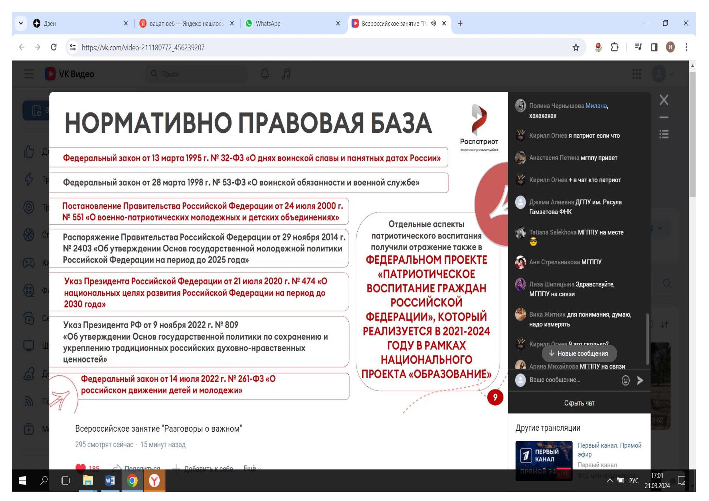 В рамках фестиваля студенческих патриотических клубов педагогических вузов и колледжей федерального проекта «Патриотическое воспитание граждан Российской Федерации» национального проекта «Образование» при поддержке Министерства просвещения Российской Федерации 21 марта 2024 года состоялось Всероссийское занятие «Разговоры о важном» на тему «Патриотизм сегодня», которое провела Елена Беликова, руководитель программы Роспатриот Федерального агентства по делам молодежи, доктор политических наук.