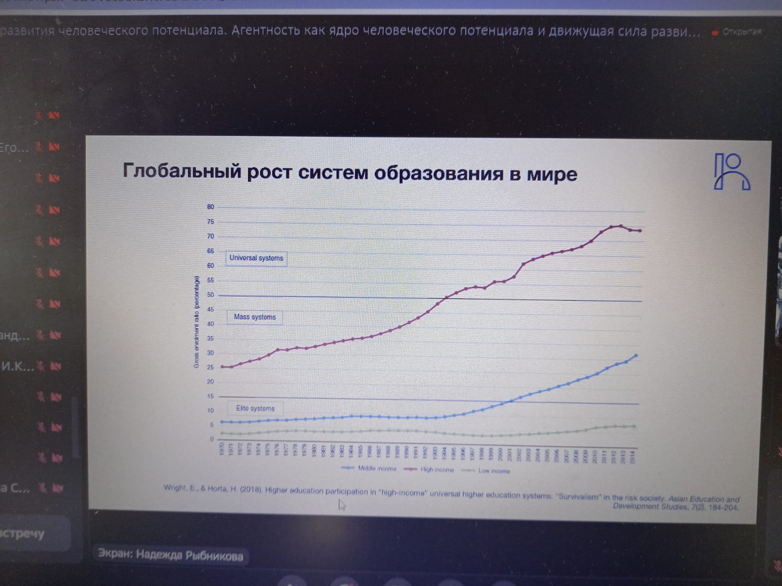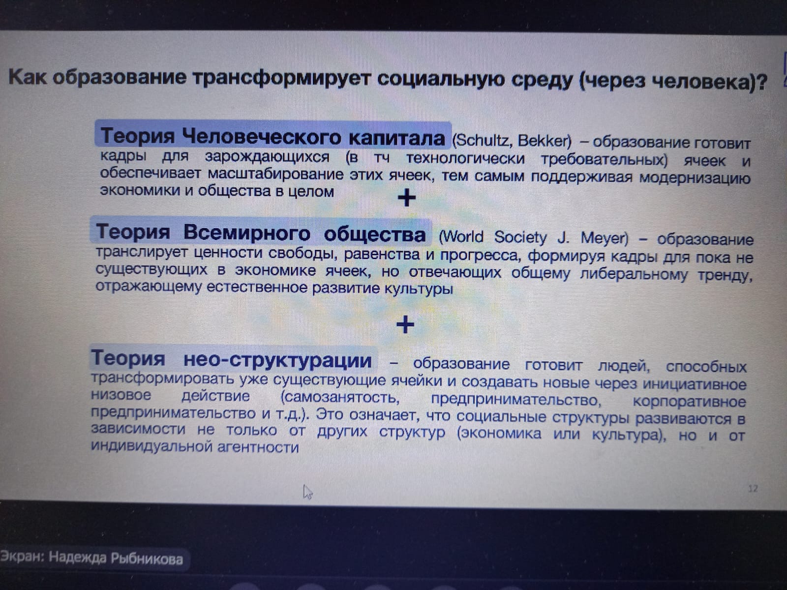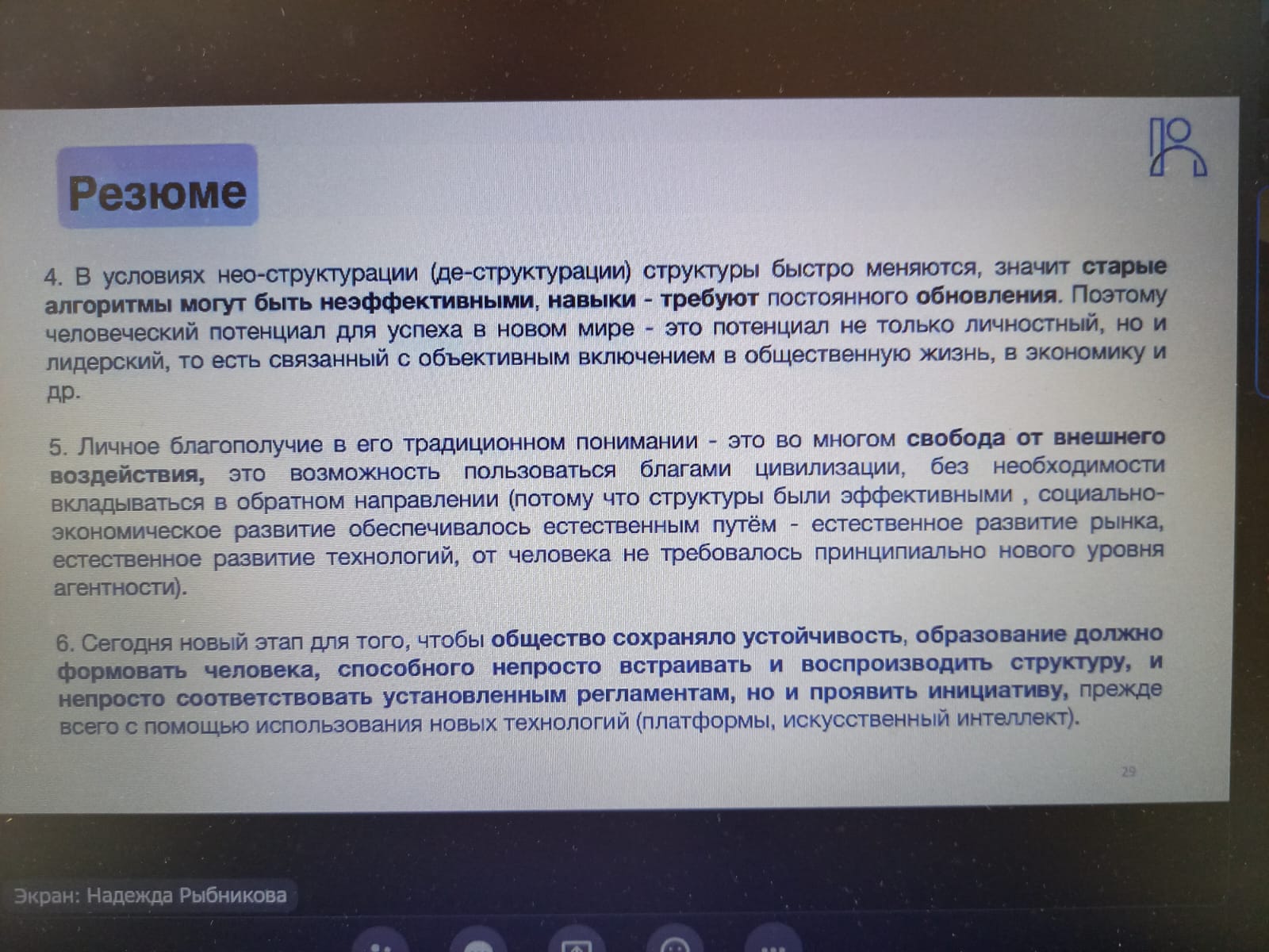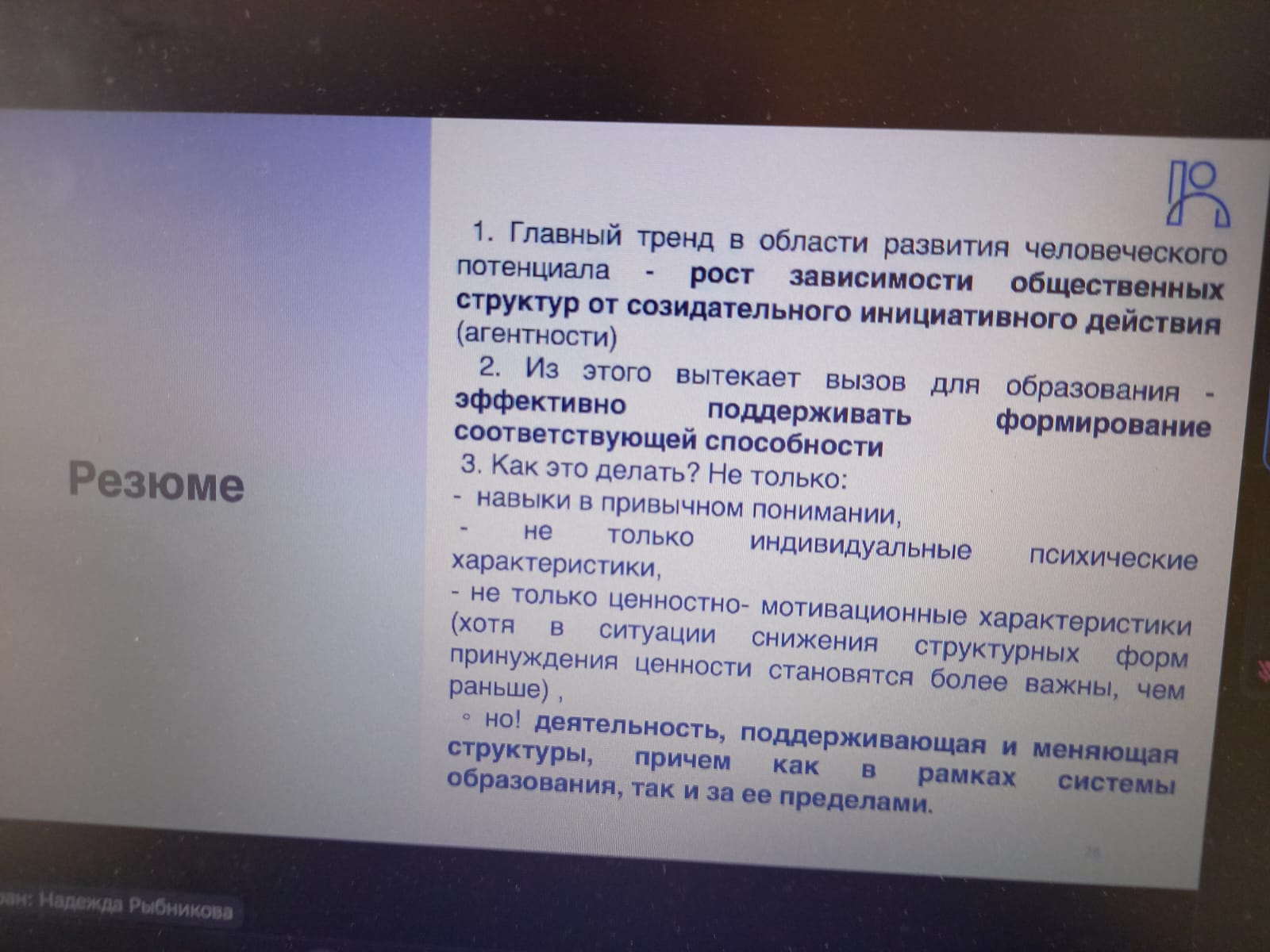 Спикер семинар Сорокин Павел Сергеевич, канд. социол. наук, заведующий Лабораторией исследований человеческого потенциала и образования НИУ ВШЭ, НЦМУ «Центр междисциплинарных исследований человеческого потенциала» рассмотрел ключевые глобальные тренды, определяющие траектории развития важнейших компонентов человеческого потенциала. Ключевой запрос к человеку на горизонте ближайших лет - это запрос на агентность, самостоятельность, то есть способность принимать решения и эффективно действовать в различных контекстах и сферах общественной и личной жизни в ситуации отсутствия прямого принуждения и контроля со стороны внешних по отношению к человеку сил.