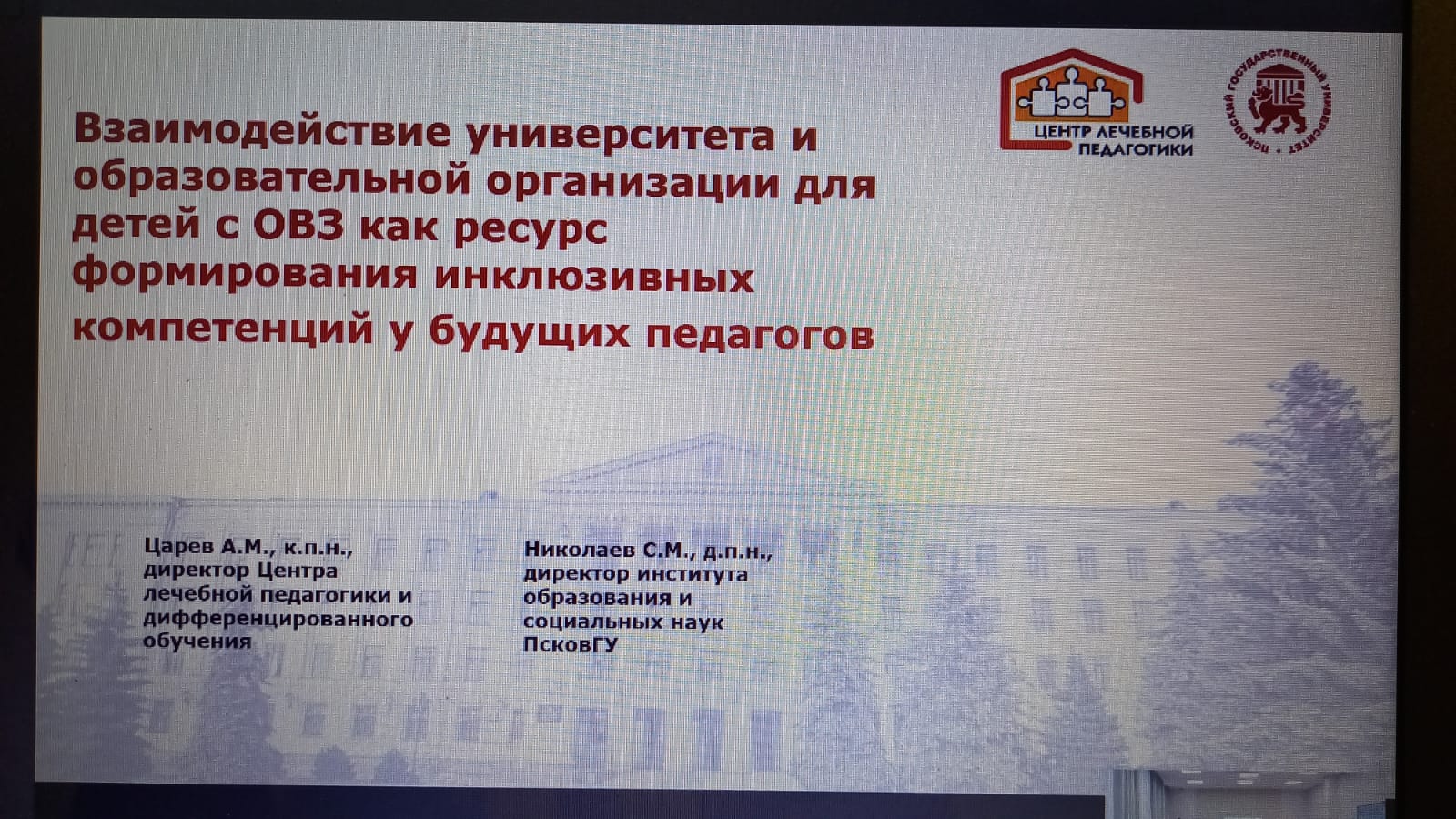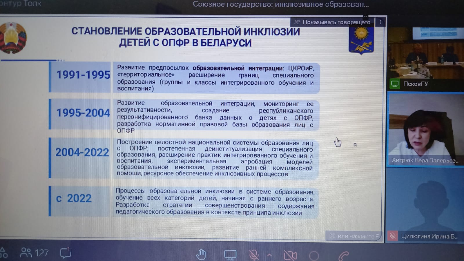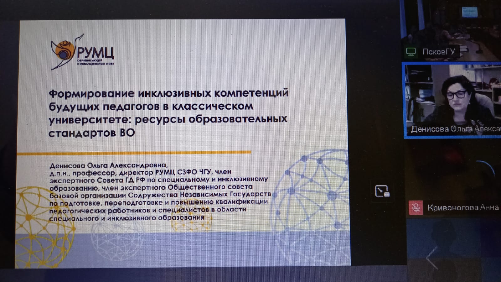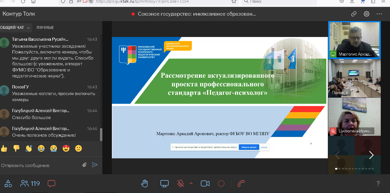 14 ноября в рамках проведения Российско-Белорусского форума «Союзное государство: инклюзивное образование. Центры и технопарки» на базе Псковского государственного университета состоялось открытое заседание Федерального учебно-методического объединения высшего образования по УГСН 44.00.00 «Образование и педагогические науки» на тему «Формирование инклюзивных компетенций у педагогов при реализации ФГОС 4-го поколения». В работе открытого заседания ФУМО приняла участие зав. кафедрой специальной педагогики и психологии Цилюгина И.Б.