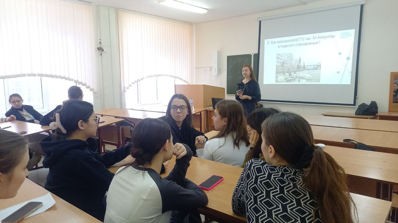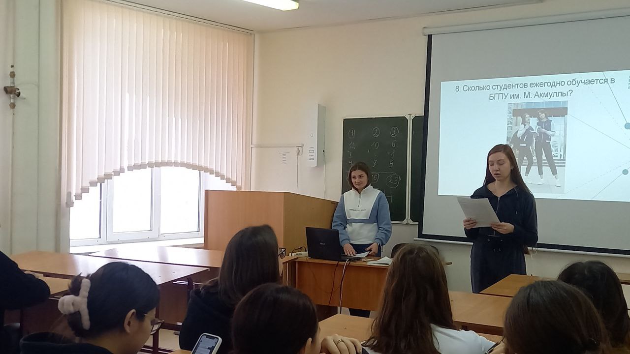 В преддверии 58-летия со дня основания Акмуллинского университета студенты 2 курса кафедры специальной педагогики и психологии Кутьина Дарья и Титова Арина организовали и провели со студентами 1 курса (куратор Дильмухаметова Р.С.) викторину, посвященную истории родного вуза.