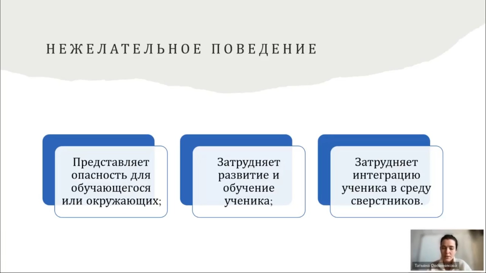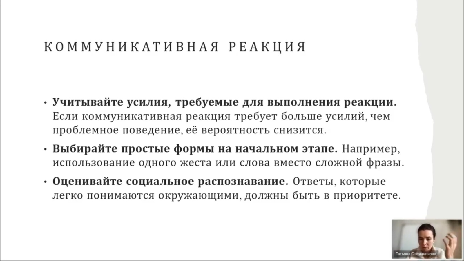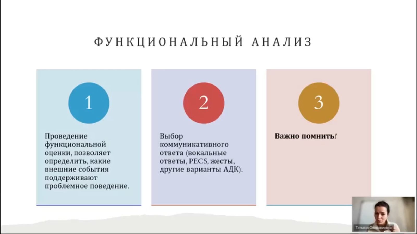 На вебинаре слушатели подробнее узнали о нежелательном поведении, вмешательствах при нежелательном поведении, познакомились с тренингом функциональной коммуникации, уточнили эффективные стратегии работы с детьми РАС.