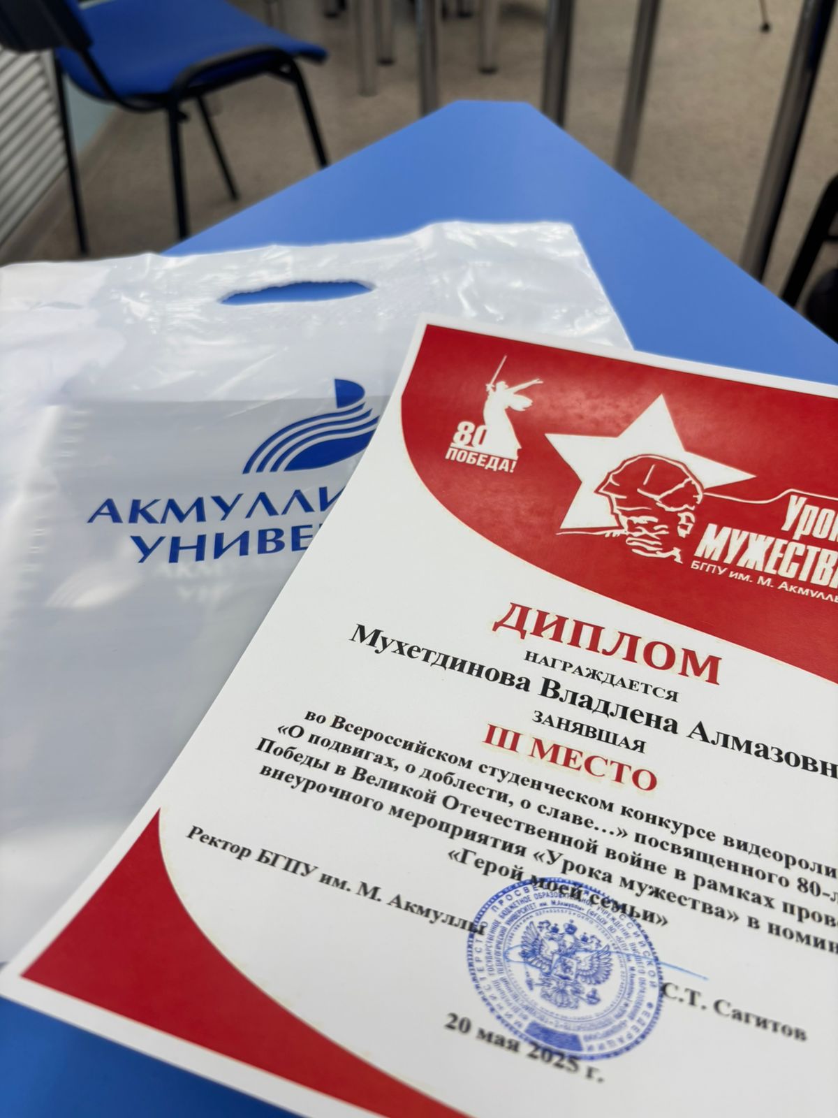 По итогам отборочного тура Всероссийского конкурса видеороликов студентка Института педагогики кафедры специальной педагогики и психологии, группы СОДД-11-24 Мухетдинова Владлена вышла в финал и заняла III место в номинации «Герой моей семьи».