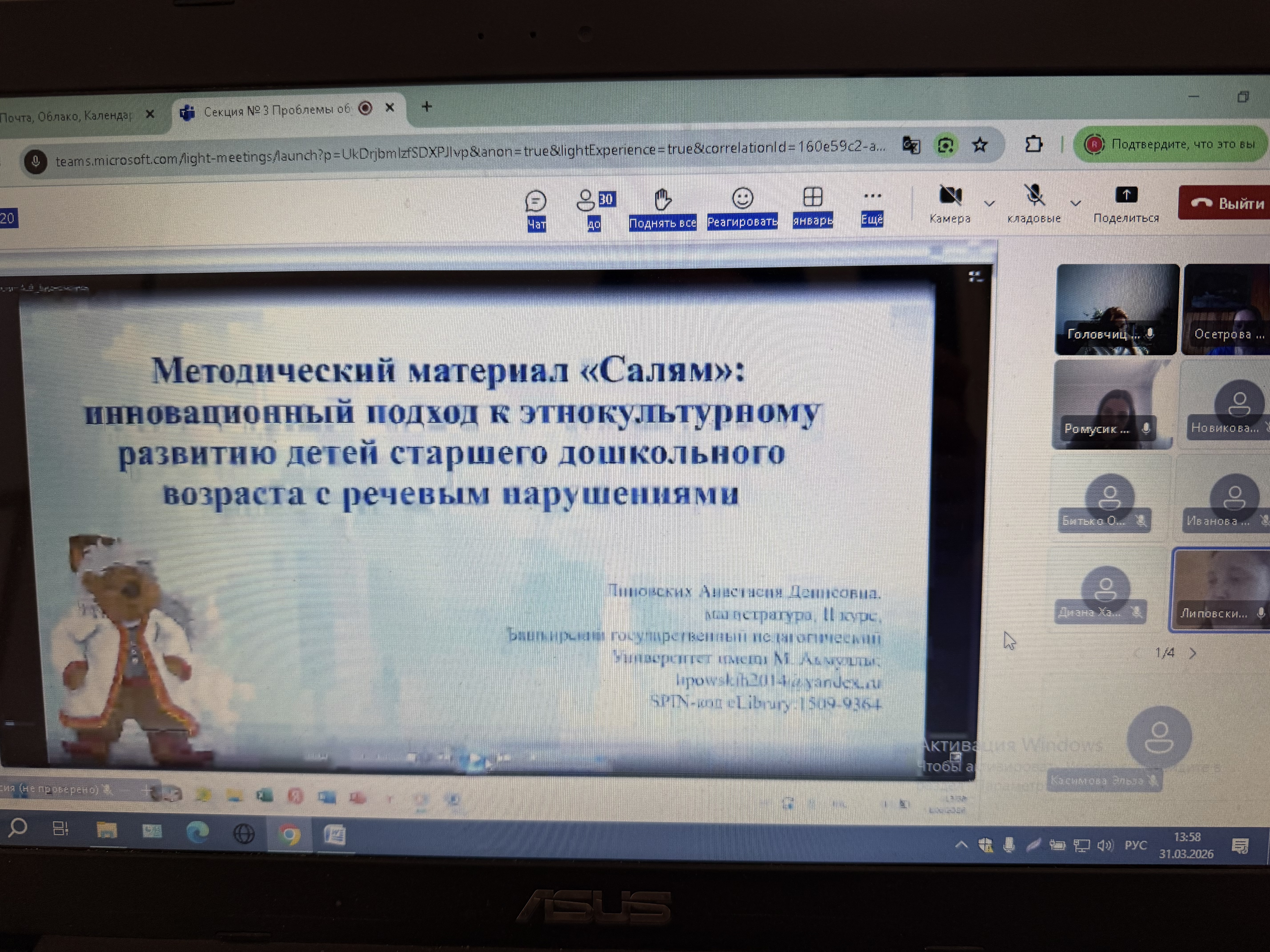 Преподаватели и магистранты кафедры специальной педагогики и психологии приняли участие в работе данной конференции. В рамках работы секции «Проблемы обучения и воспитания дошкольников с ограниченными возможностями здоровья» магистрантка 2 курса Липовских Анастасия выступила с научным докладом «Методический материал «Салям»: инновационный подход к этнокультурному развитию детей старшего дошкольного возраста с речевыми нарушениями» (науч.рук-ль: канд.пед.наук, доцент Касимова Э.Г.).