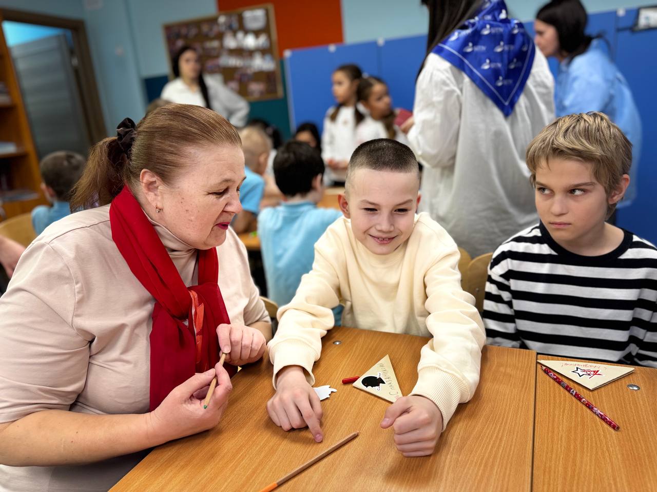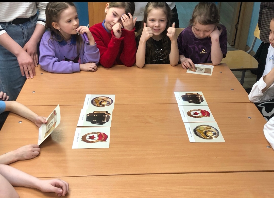 Ребята проявили активность и любознательность. Девочки и мальчики быстро находили пары карточек, с изображением экспонатов Республиканского музей Боевой Славы, научились складывать фронтовые письма-треугольники.