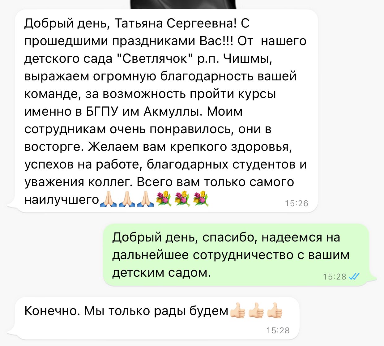 От  нашего детского сада "Светлячок" р.п. Чишмы, выражаем огромную благодарность вашей команде, за возможность пройти курсы именно в БГПУ им Акмуллы. Моим сотрудникам очень понравилось, они в восторге. Желаем вам крепкого здоровья, успехов на работе, благодарных студентов и уважения коллег. Всего вам только самого наилучшего.