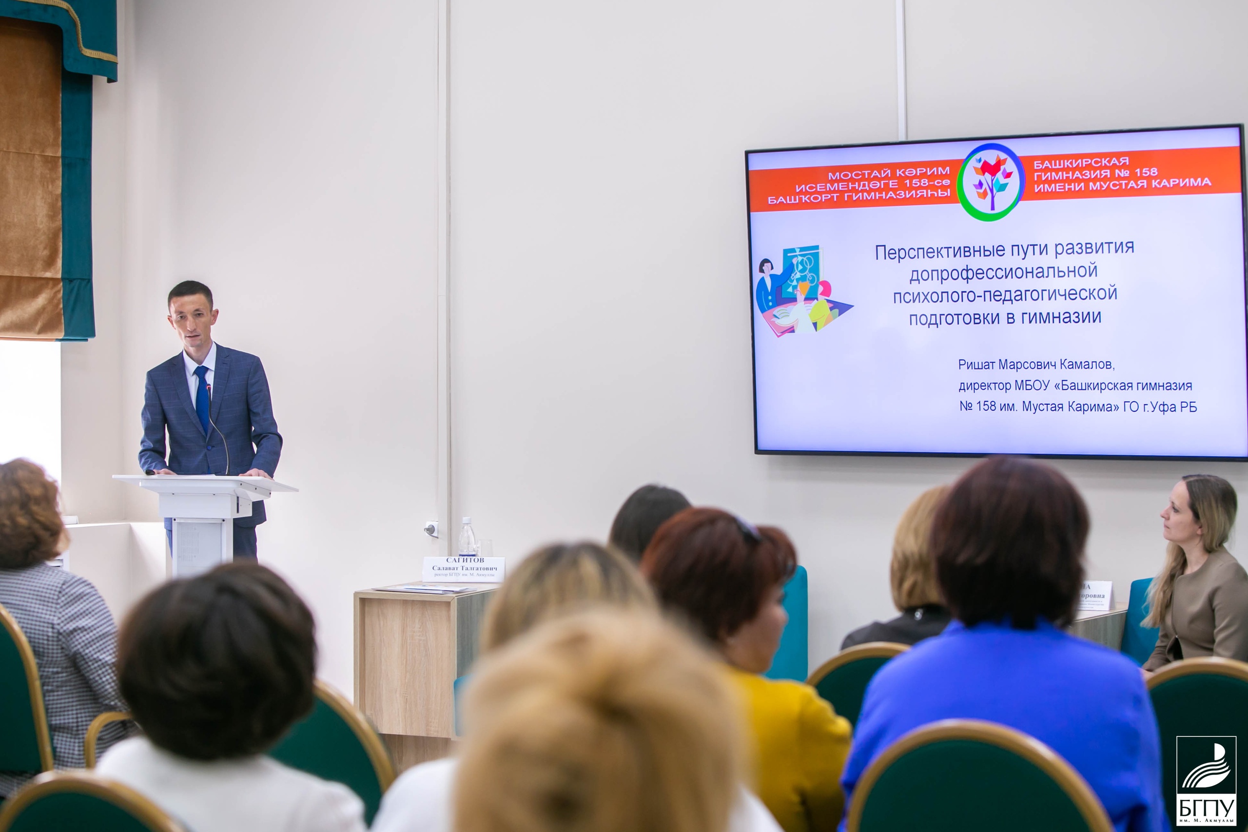Директор «Башкирского лицея №2» города Уфы Миляуша Мурзагалина рассказала, как проходило внедрение модели единого образовательного пространства в лицее. А директор «Башкирской гимназии №158 имени Мустая Карима» города Уфы Ришат Камалов представил перспективные пути развития допрофессиональной психолого-педагогической подготовки в их образовательной организации.