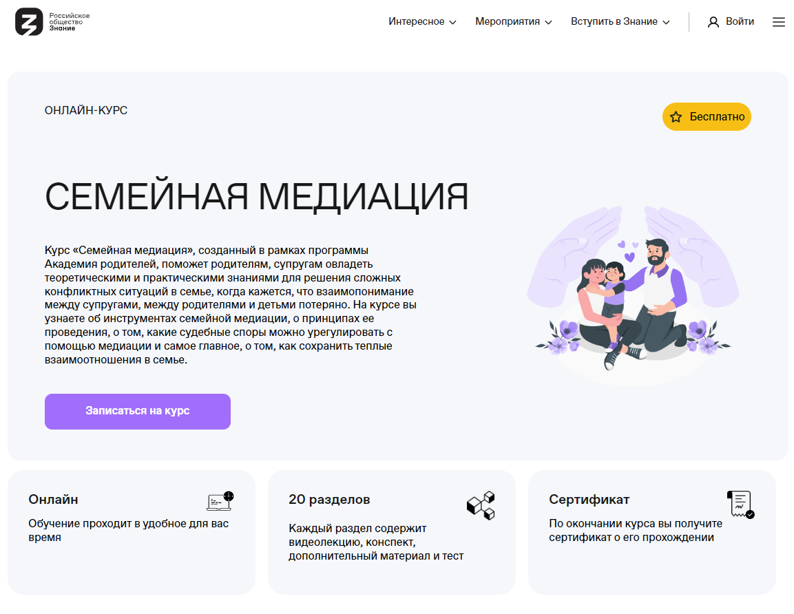 Записаться на онлайн-курс «Семейная медиация» можно на сайте Российского общества «Знание»